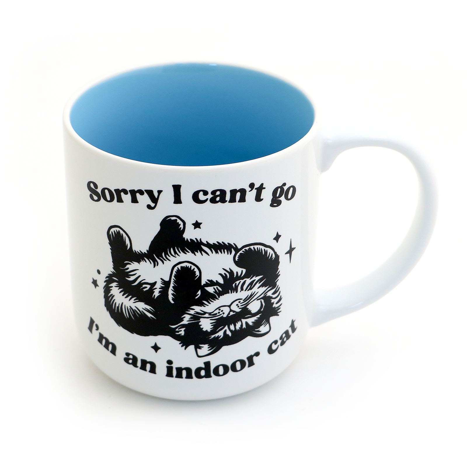 Sorry I can't go, I'm an indoor cat. Perfect cup to curl up on a cozy couch with and avoid people! This is a handmade ceramic mug created by me in my New Jersey studio. This is a stoneware mug measuring 4 x 4. Interior is soft blue. Kiln fired, lead free glazes. Holds 16 oz. Dishwasher and microwave safe. Funny gift for an introverted cat lover.