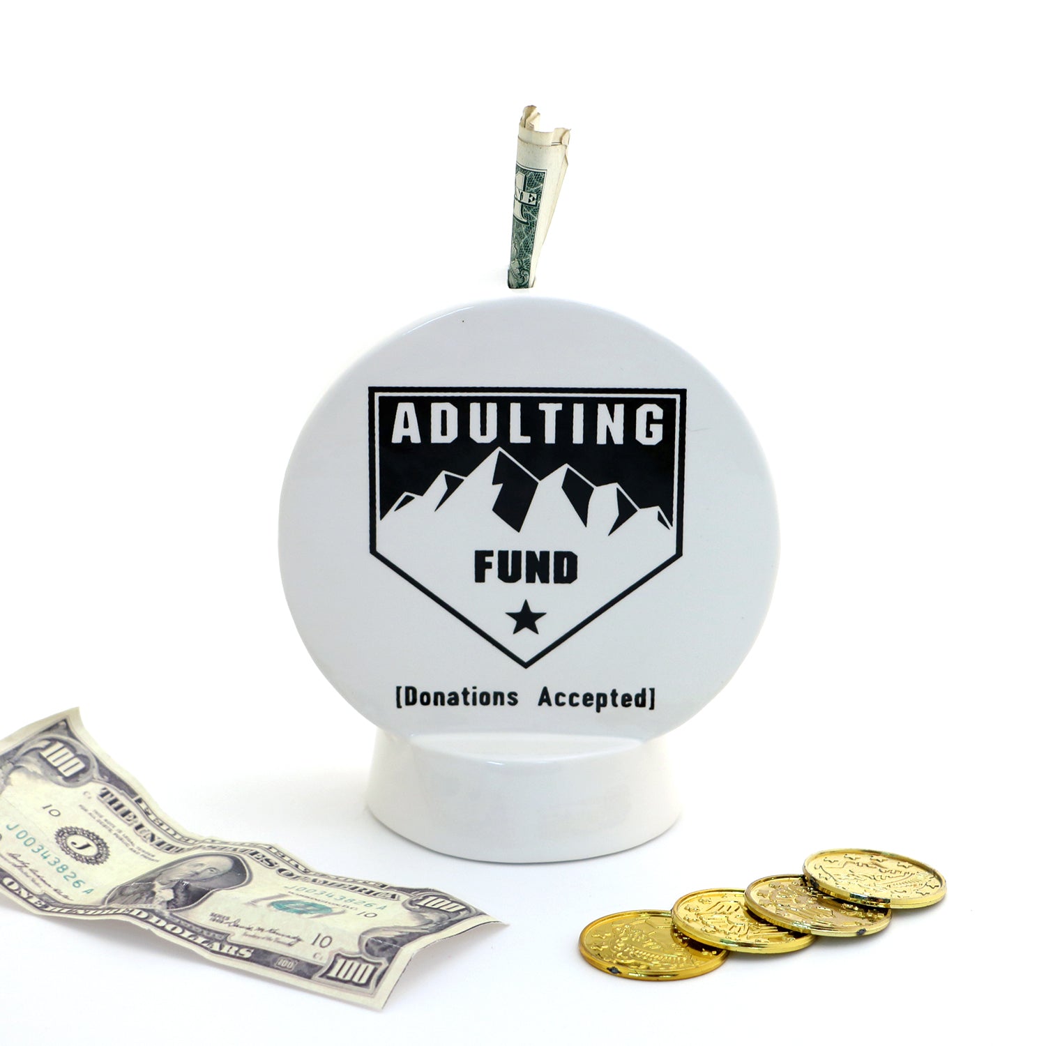 Handmade ceramic bank reads ADULTING FUND (Donations Accepted) and makes a great gift for anyone embarking on a journey to paying their own bills. Handmade from earthenware clay and kiln fired, this bank measures 6 inches high and the disc portion is 2 inches wide with a hollow base that is 3 inches. Ships with removable rubber stopper. Unusual whimsical addition to any decor. Funny birthday or graduation gift.