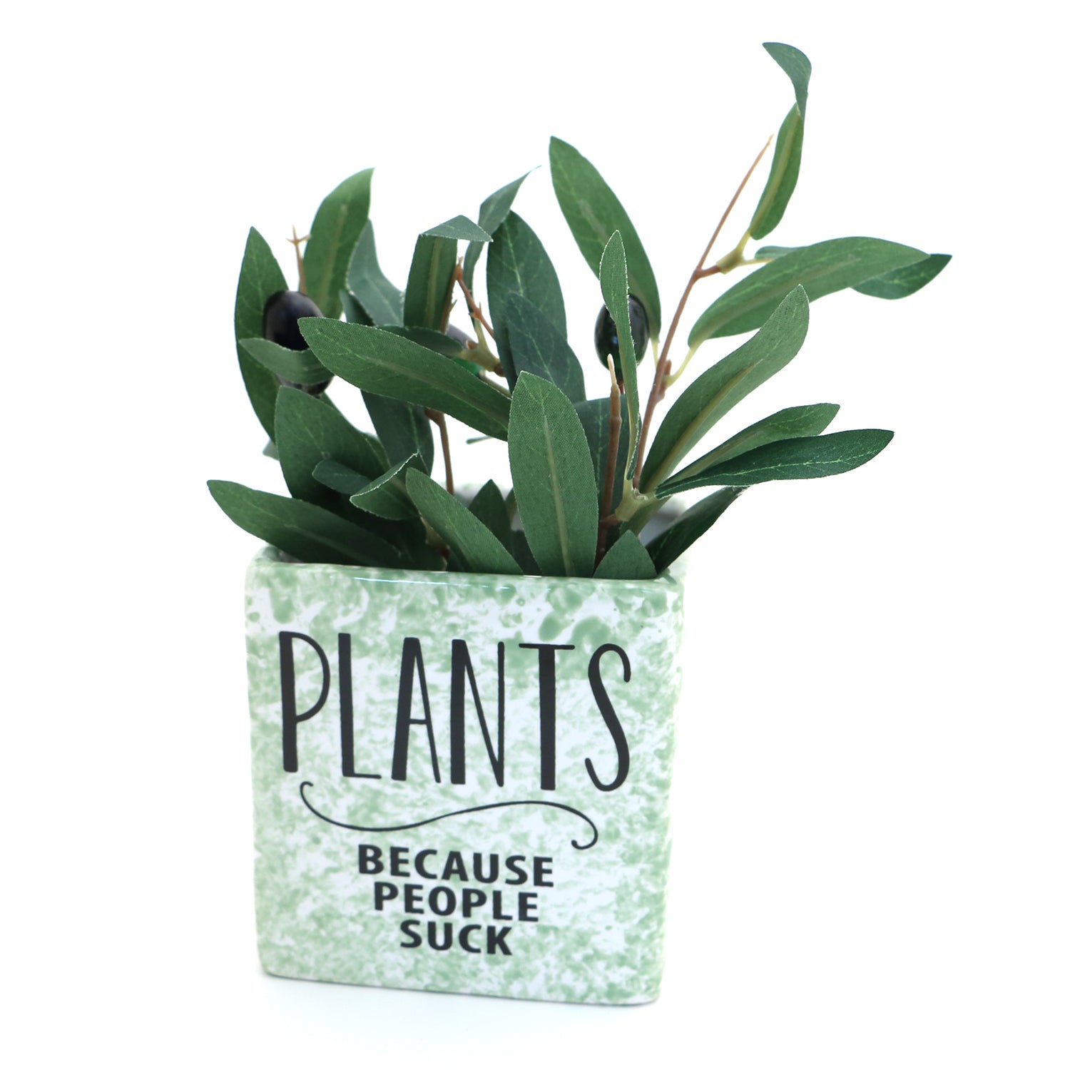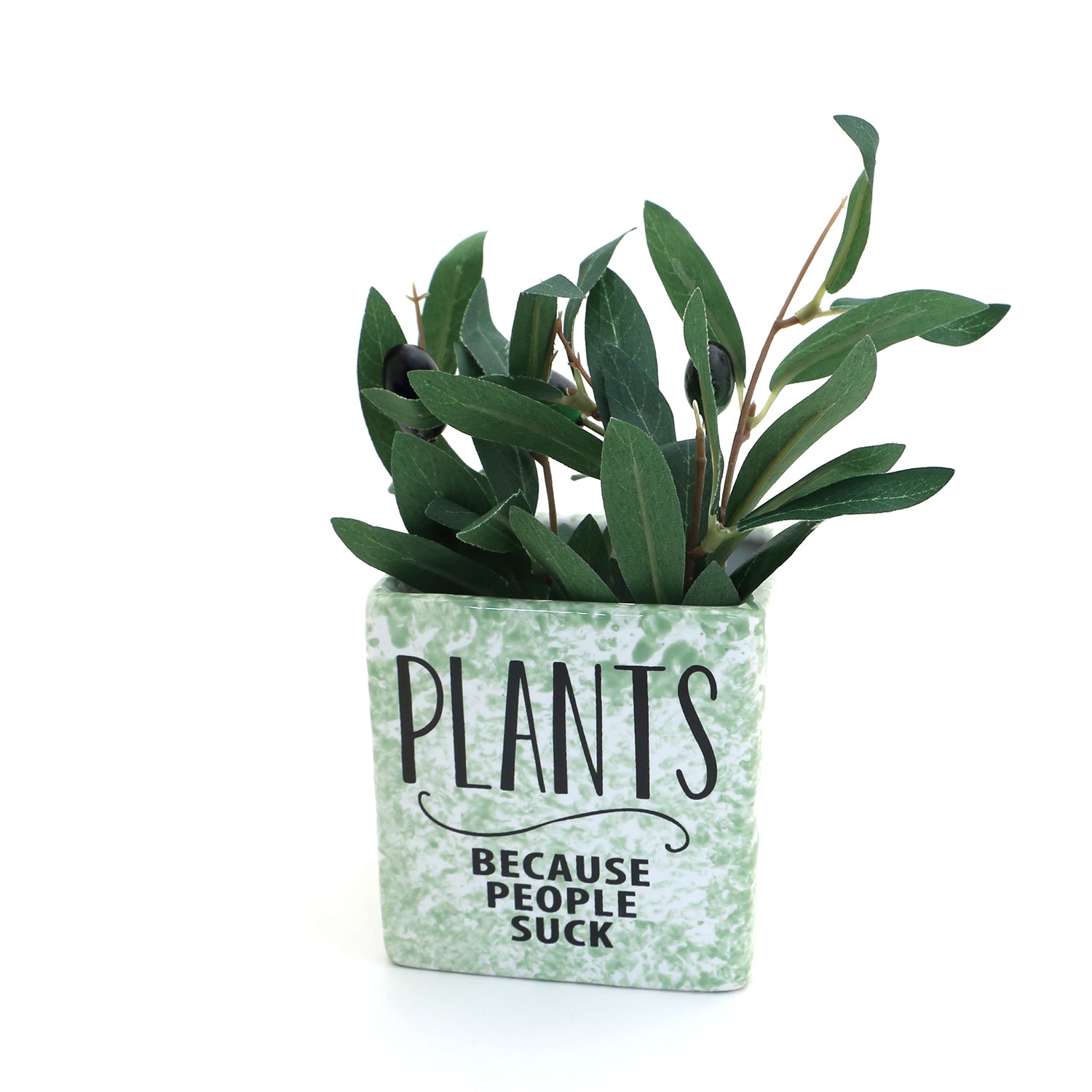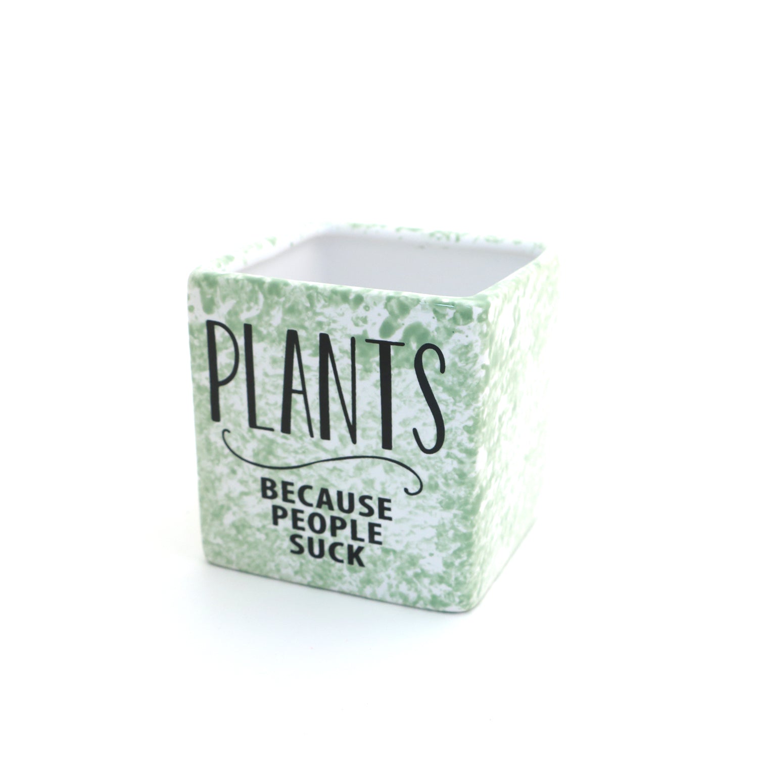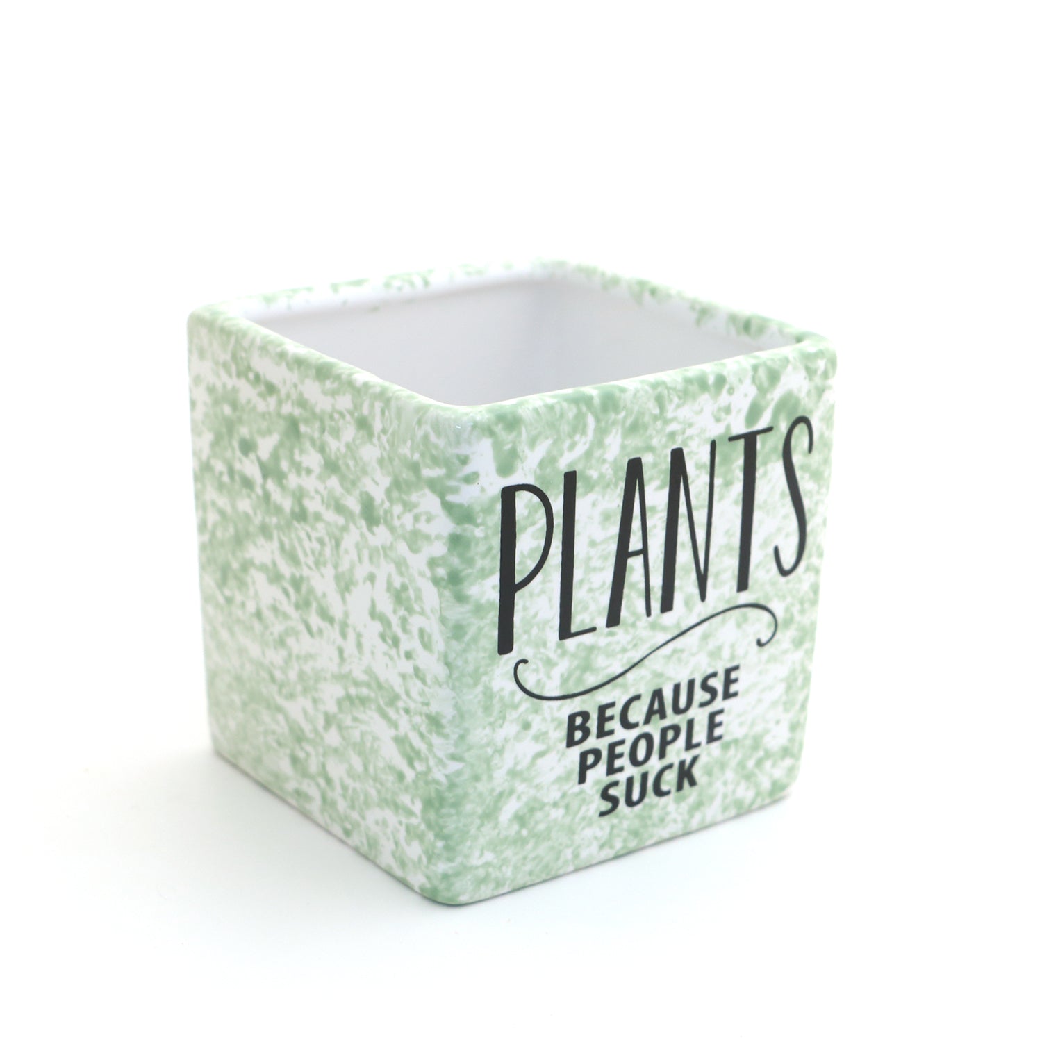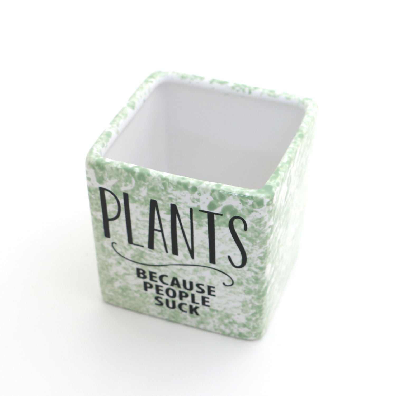 This planter speaks for any plant lover who prefers the company of those who have roots. Plants Because People Suck. Handmade ceramic measures 4 x 4 . Does not have a drainage hole- use rocks for drainage or plant succulents. Plant not included. Kiln fired to over 1900 degrees. Great gift for a Plant Mom or indoor gardener.
