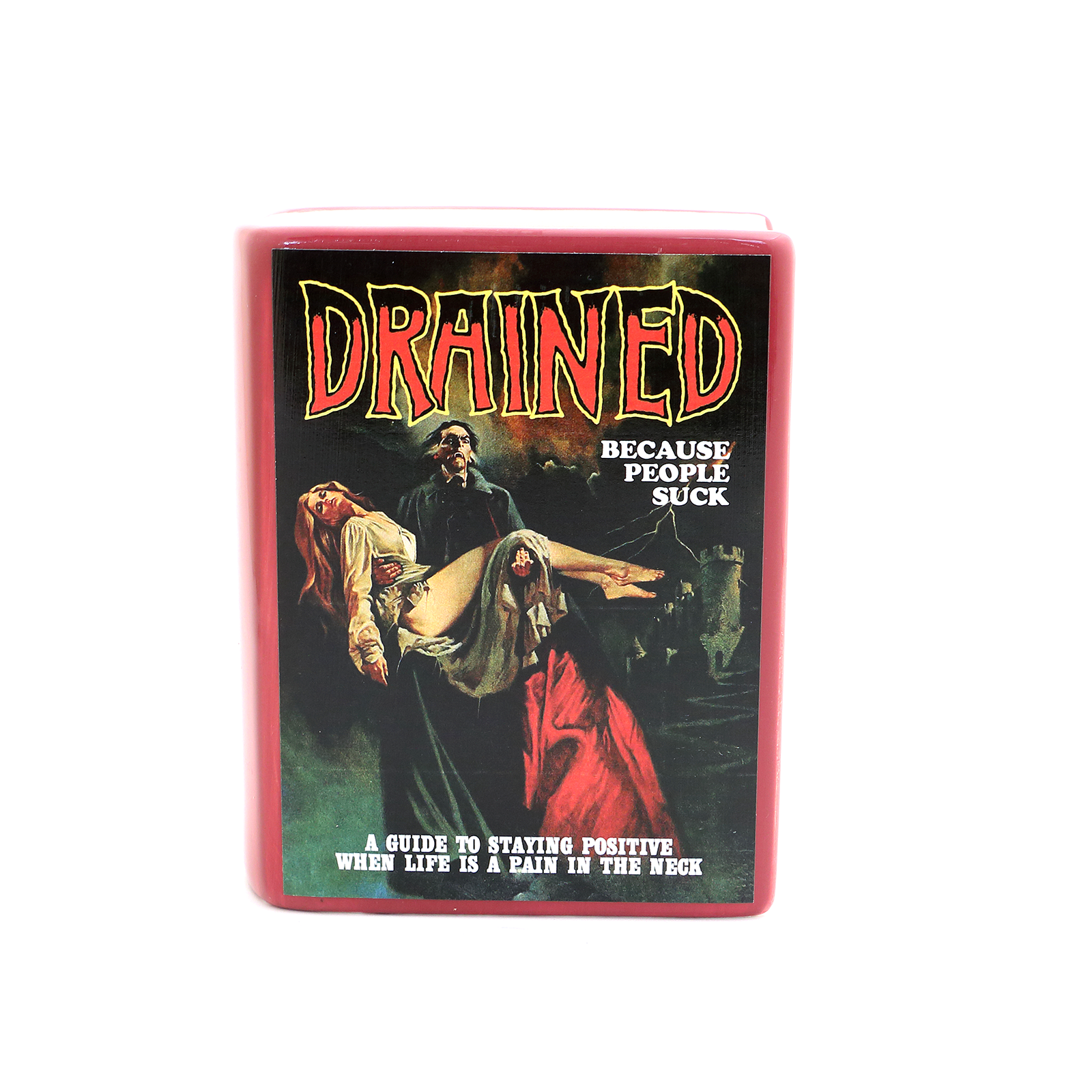 Great gift for a lover of pulp novels and salty language. Features a faux cover that reads: DRAINED Because People Suck. Subtitled: A guide to staying positive when Life is a Pain in the Neck. Dracula holds a woman in his arms.  Use it to hold pens, pencils, or brushes. It is water tight and can be used as a vase or planter (no drainage hole). Handmade in my New Jersey studio from stoneware clay, kiln fired. This piece measures 5 inches tall, 4 x 2. Cover is decoupaged on and sealed with a non yellowing varnish.