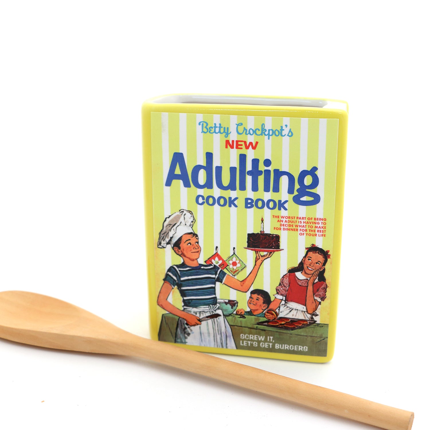 Ceramic book vase- Adulting Cook Book. A nostalgic parody of the famous Betty Crocker cookbook- this one is by "Betty Crockpot!" The worst part of being an adult is having to decide what to make for dinner for the rest of your lives. This is a handmade ceramic piece in the shape of a book. Use it to hold flowers or as a fillable container. Great gift for someone who does not like to cook. Handmade in my New Jersey studio from stoneware clay, kiln fired. This piece measures 5 inches tall, 3.5 x 2. Cover is decoupaged on and sealed with a non yellowing varnish. Some brush strokes will be visible from process of decoupage. The ceramic book itself is bright yellow with white pages- colors may appear differently on your computer monitor.