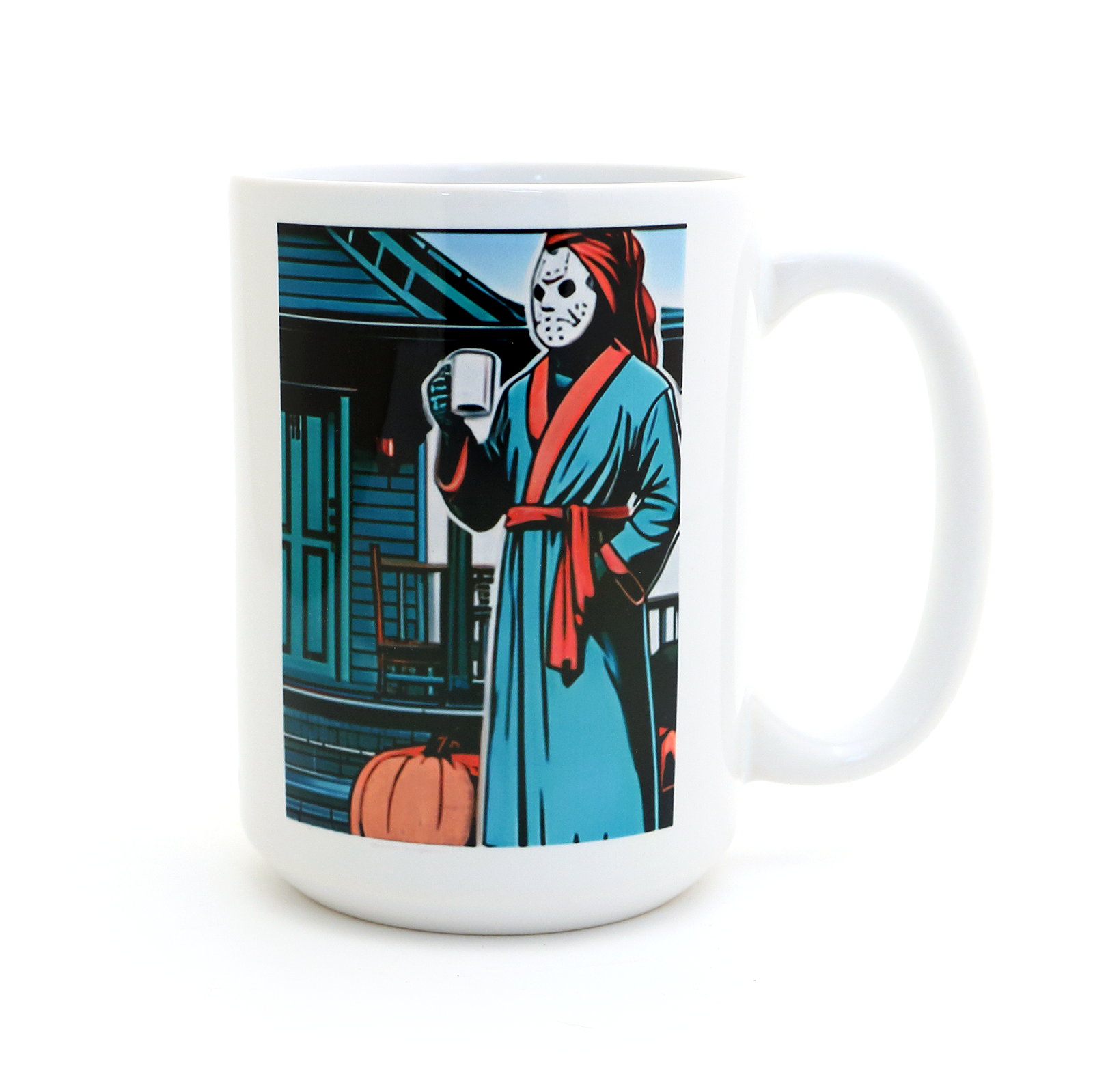Jason- Mornings are Murder Mug, Halloween Movie mug features the main character Jason Voorhees from the movie "Friday the 13th"" in a bathrobe holding a cup of coffee. The back says "Mornings are Murder" with the famous deadly machete. Great Halloween gift that will be enjoyed all year long. Made from stoneware clay, this mug measures 4.5" H x 3.4" OD and holds 15 oz. Created with all lead free, non toxic materials- safe to place in the dishwasher and microwave. Made to be used and enjoyed.
