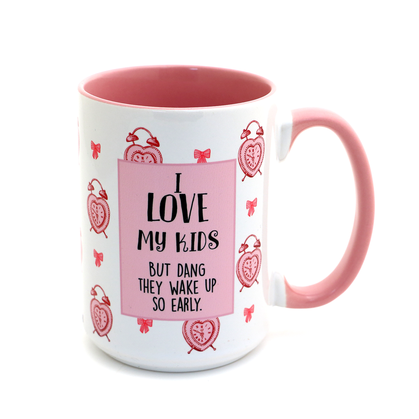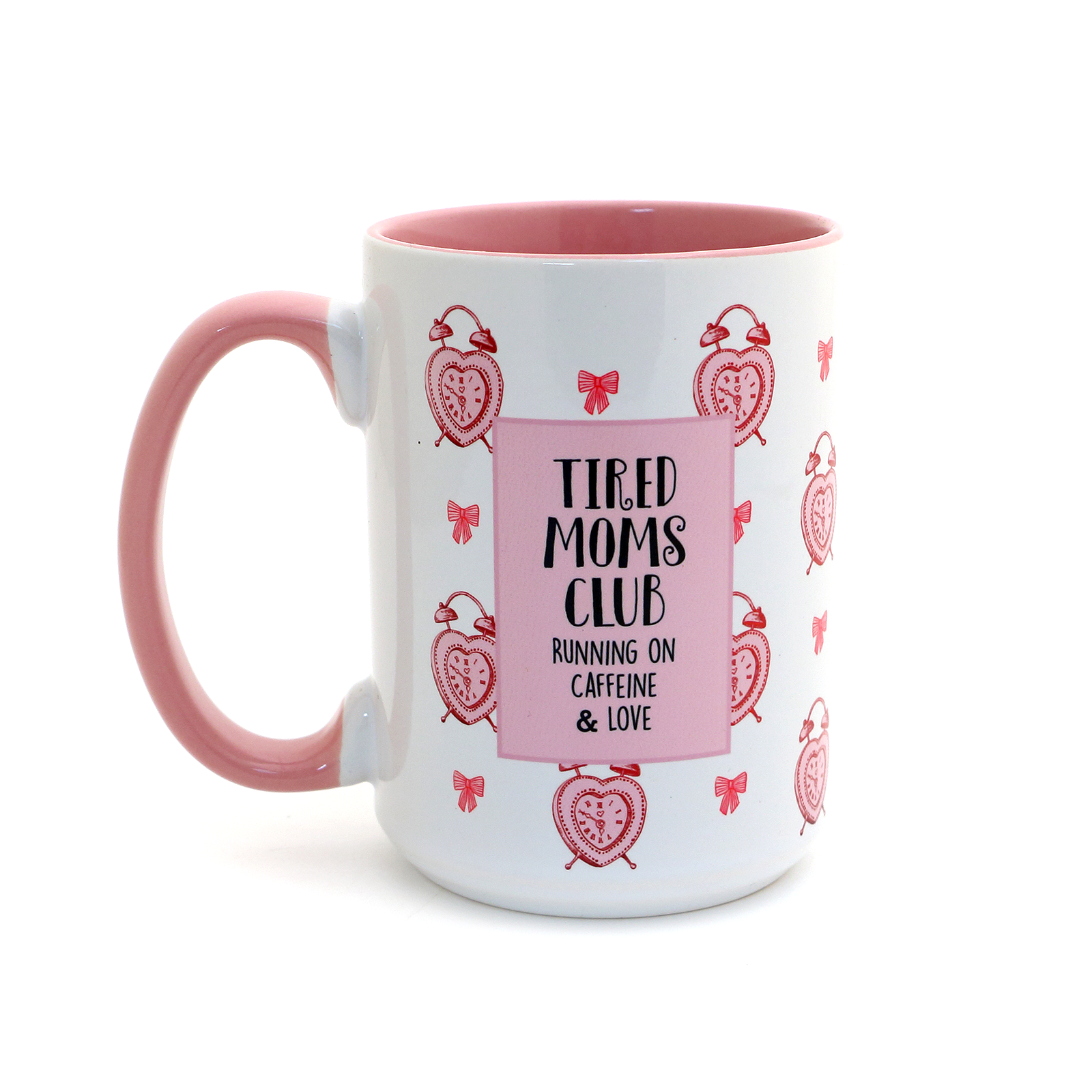Tired Moms Club Mug. Front reads: I Love My Kids, but dang they wake up so early. Back reads: Tired Moms Club, running on caffeine and love. This mug is created from stoneware clay kiln fired to over 1900 degrees. Mug is glossy white with pink illustrated clocks, a pink handle and a pink interior.