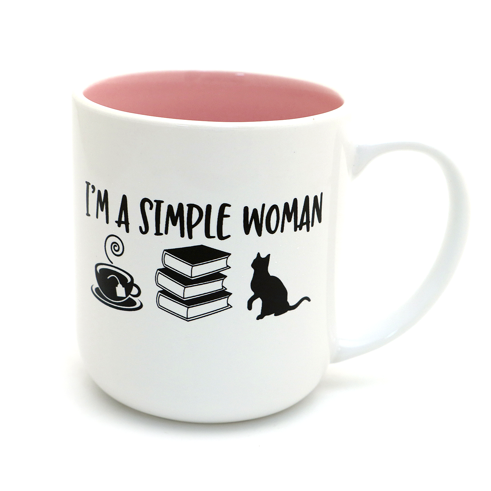 Books, cats, and tea- what more could a gal want? This mug reads I'm a Simple Woman and features three of her very favorite things. Interior is soft pink. Handmade from stoneware clay, this mug measures 4 x 4 and holds 16 oz. Created with all lead free, non toxic materials- safe to place in the dishwasher and microwave.