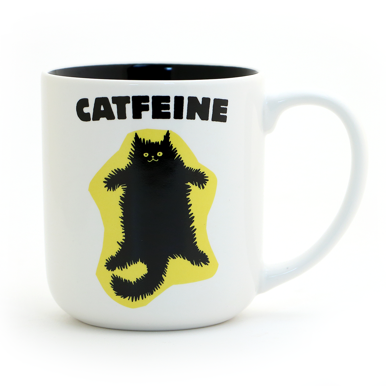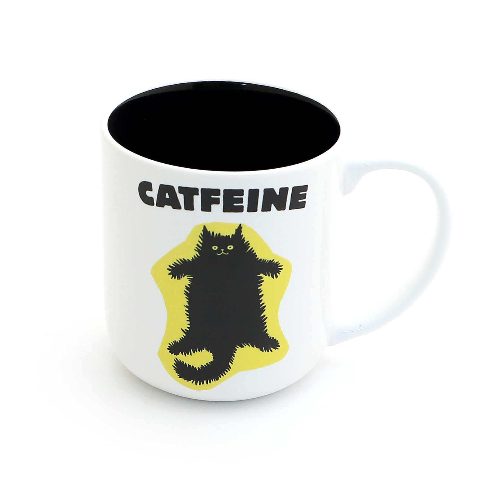 This funny cat mug makes a great gift for any cat lover. It reads: Catfeine on the front and "Without it I'm Catatonic" on the back. Interior is black. Handmade from stoneware clay, this large mug measures 5.5" x 3.75" x 4.25" and holds 16 oz. Created with all lead free, non toxic materials- safe to place in the dishwasher and microwave. Made to be used and enjoyed. A fresh new update on one our most popular designs.