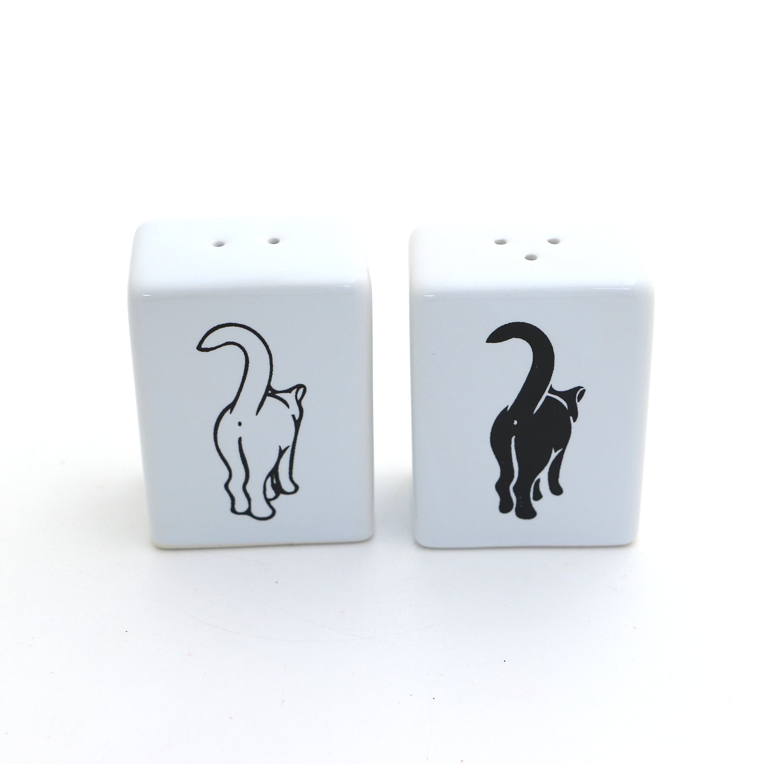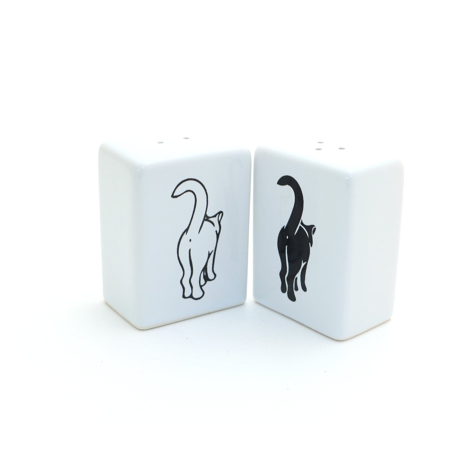 Cat Butt Salt and Pepper set should always be allowed up on the table! A great gift for someone who knows and loves cats. Created in my New Jersey studio from cast stoneware. Each shaker measures 2.5 inches high x 1 x 2 (rectangular in shape). Glazed a glossy, lead free white, kiln fired to over 1900 degrees. Ships with a removable silicon stopper.