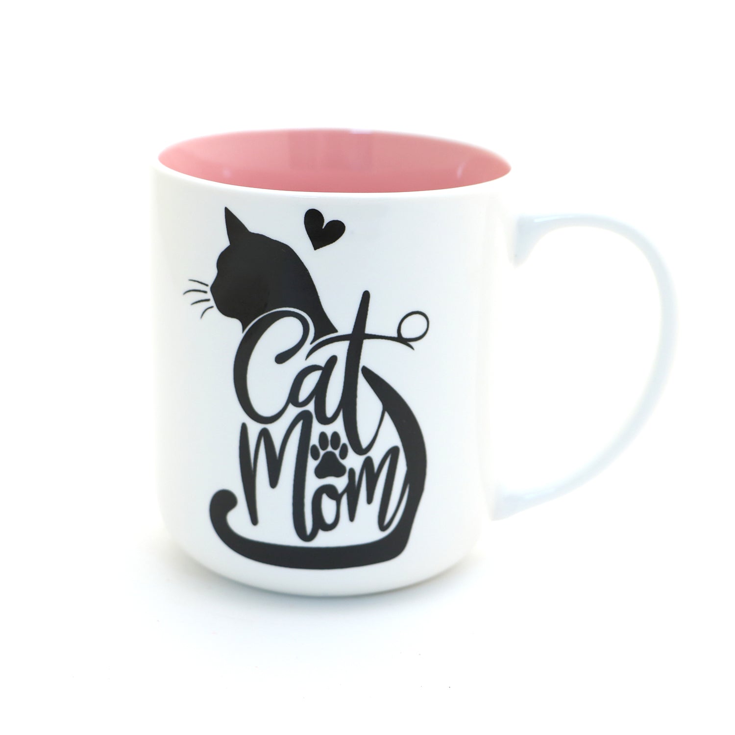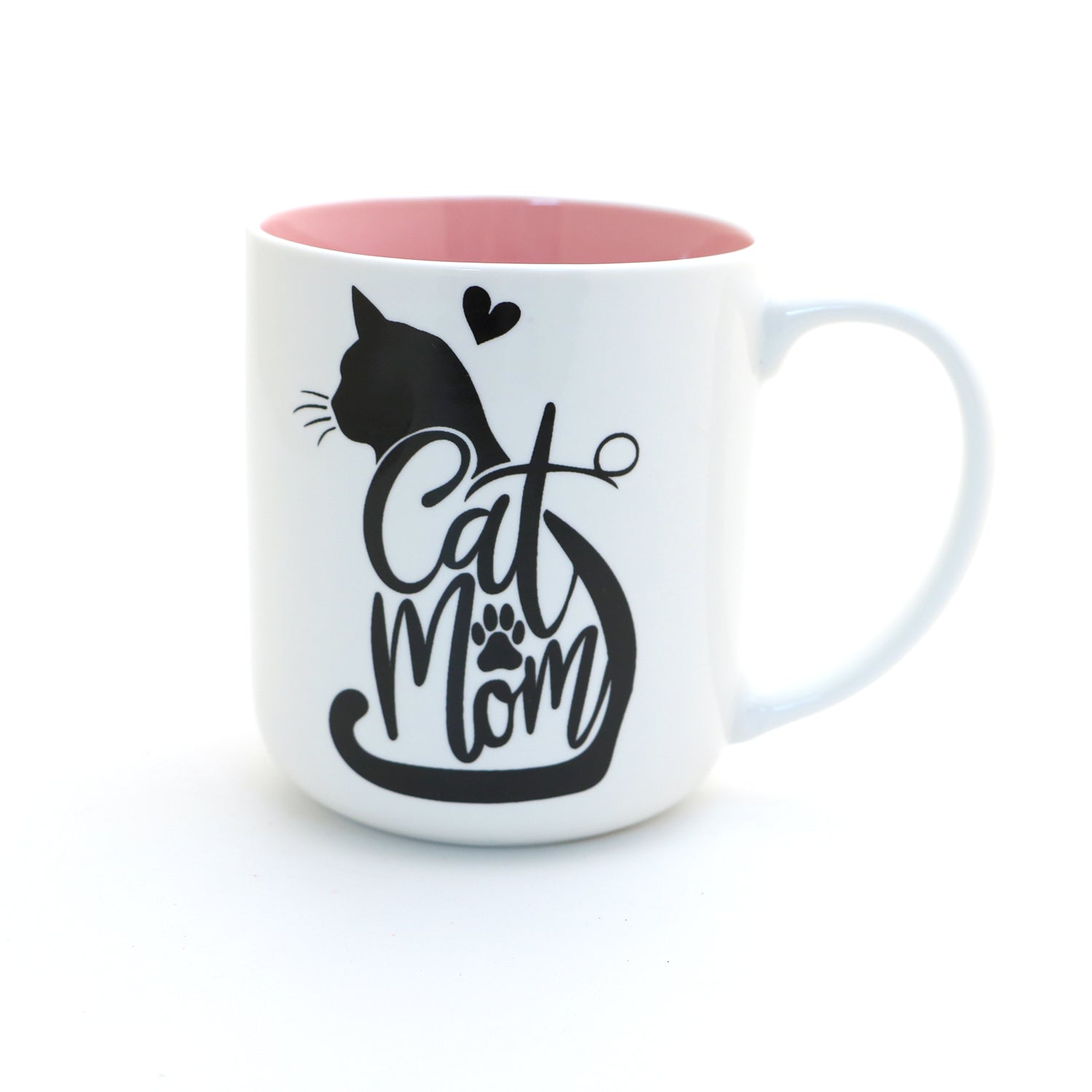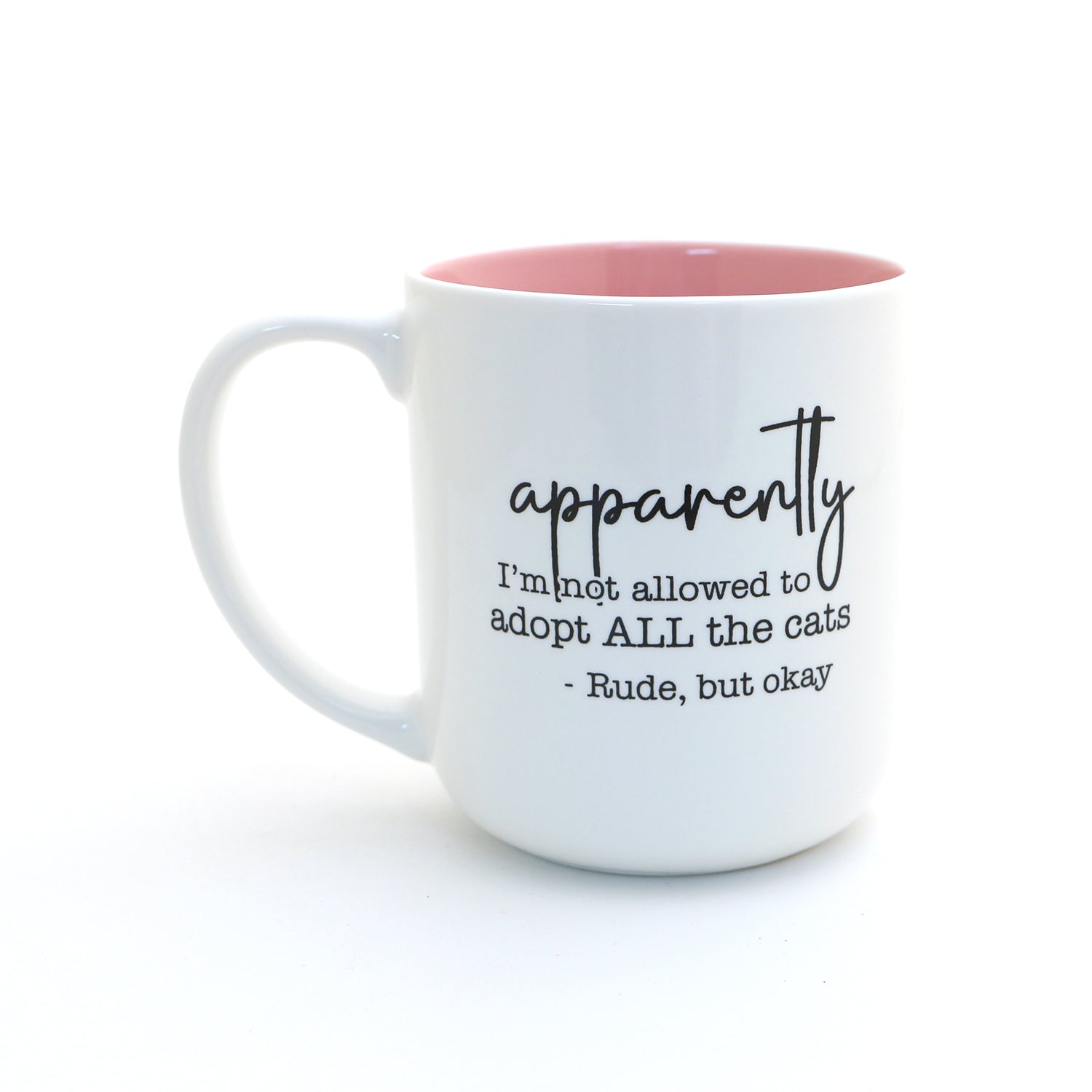 Cat Mom mug. Back reads: Apparently I can't adopt all the cats. Rude, but okay. Great gift for a cat lover. Interior is pink. Handmade from bone china clay, this mug measures 3.75 x 5.5 x 4.25 and holds 16 oz. Created with all lead free, non toxic materials- safe to place in the dishwasher and microwave. Made to be used and enjoyed. Purrfect gift for any woman whose favorite children have four legs.Â