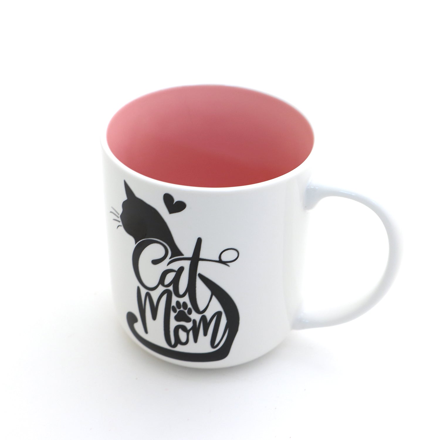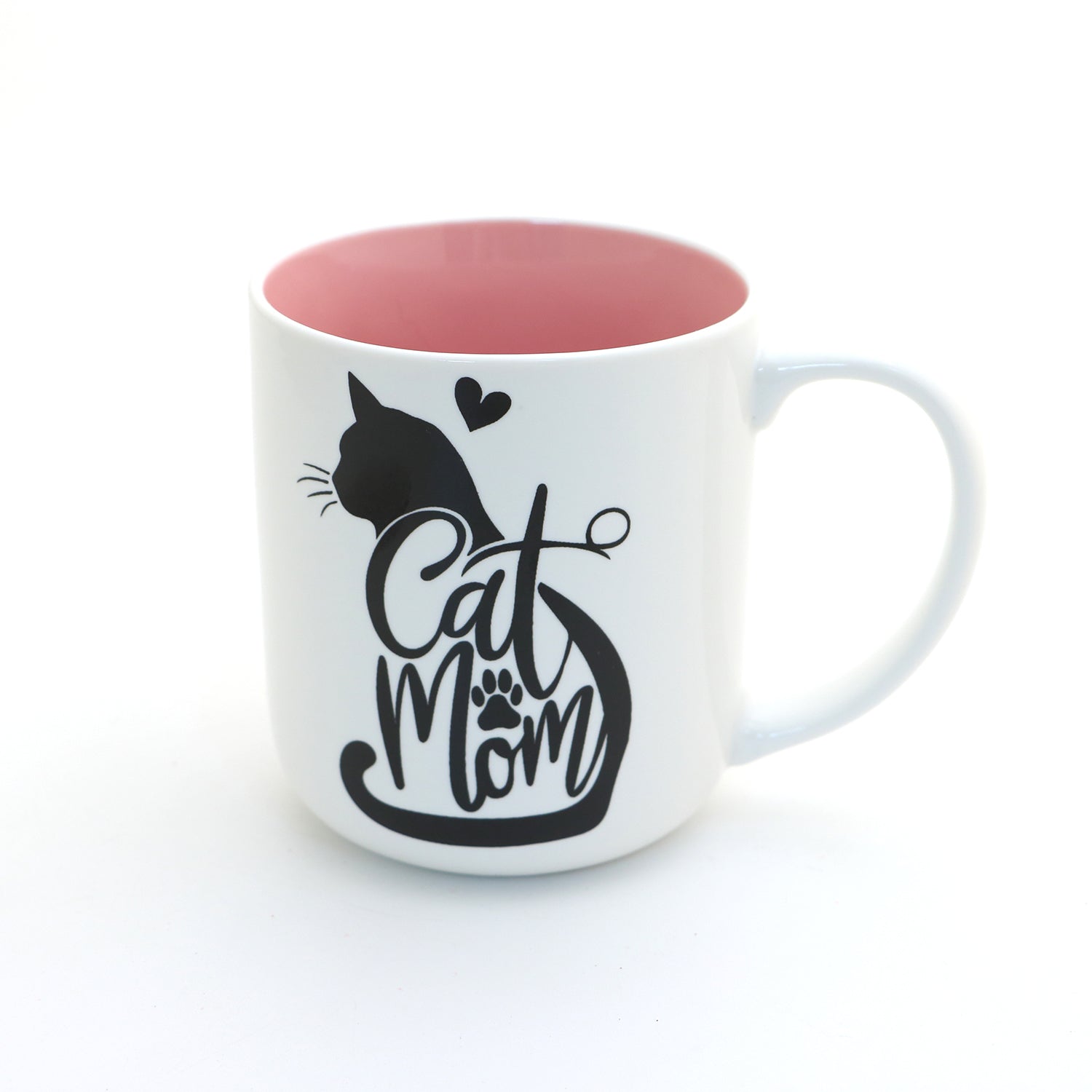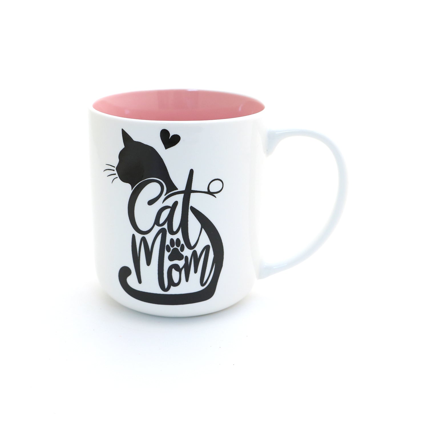 Cat Mom mug. Back reads: Apparently I can't adopt all the cats. Rude, but okay. Great gift for a cat lover. Interior is pink. Handmade from bone china clay, this mug measures 3.75 x 5.5 x 4.25 and holds 16 oz. Created with all lead free, non toxic materials- safe to place in the dishwasher and microwave. Made to be used and enjoyed. Purrfect gift for any woman whose favorite children have four legs.Â