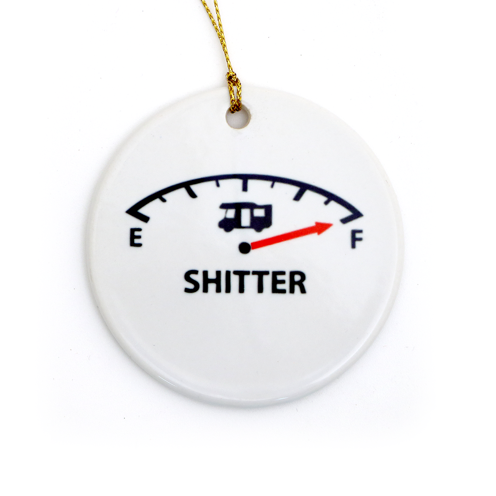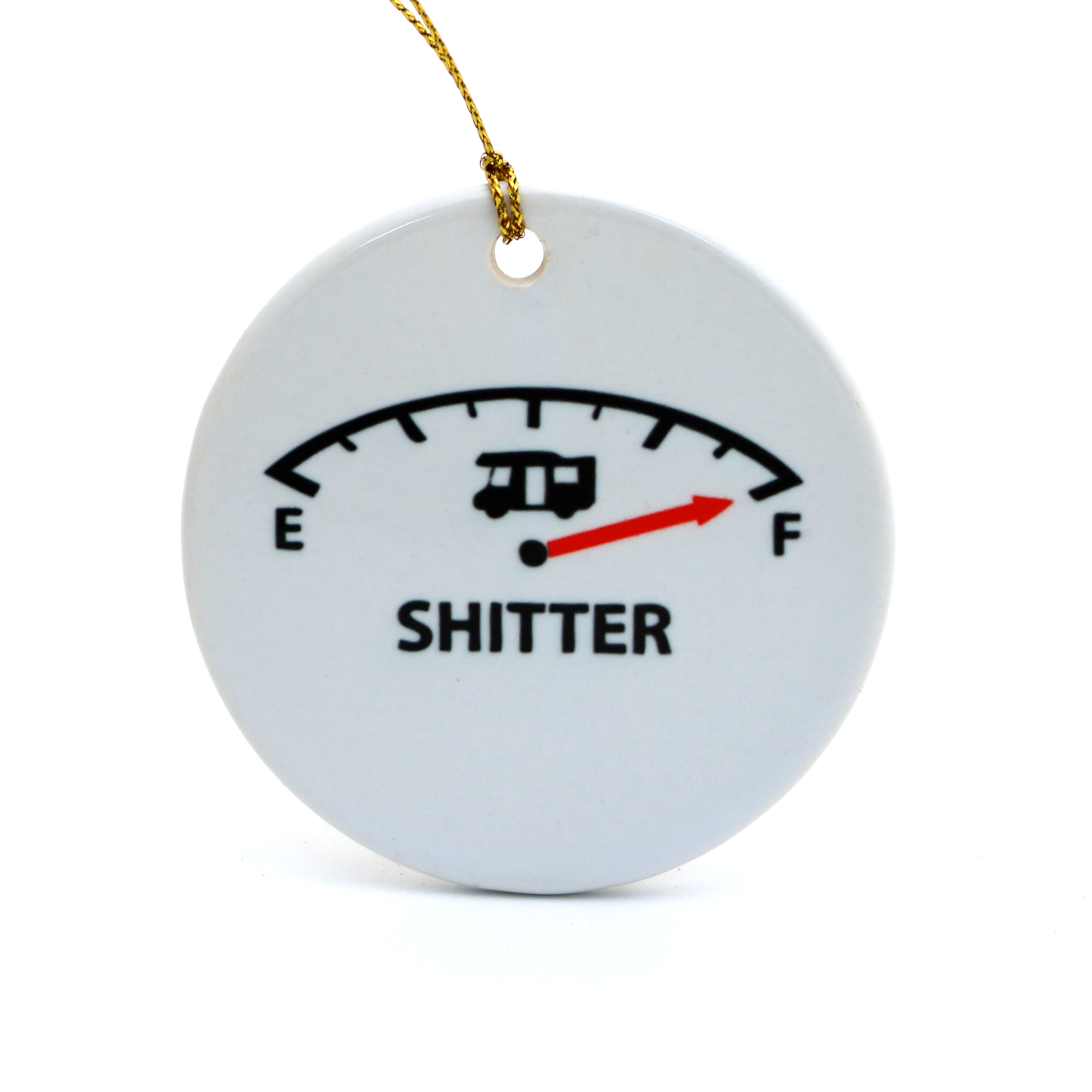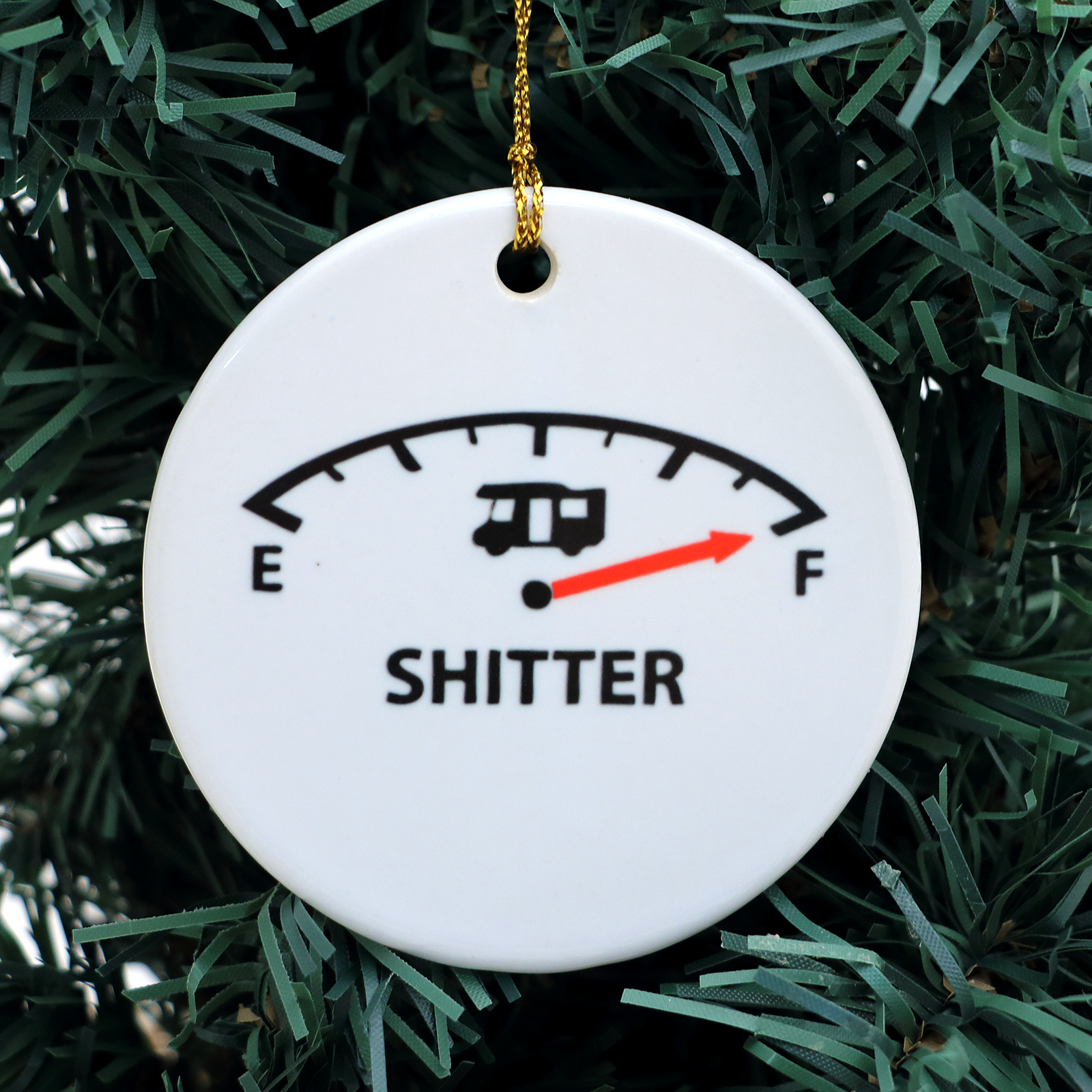 The perfect funny ornament for a Christmas Vacation lover in your life. This ornament features an homage of an empty to full meter and reads "SHITTER." Porcelain clay, flat, 3x 3. Makes a great gift for anyone who is a fan of this awesome Christmas movie. It comes in a small gift box (shown with different ornament).