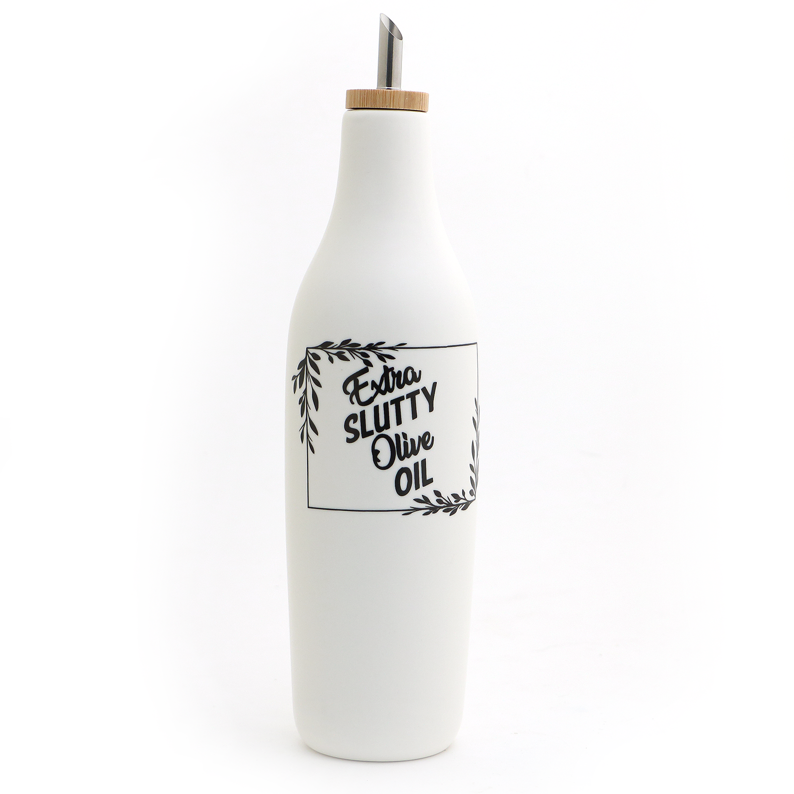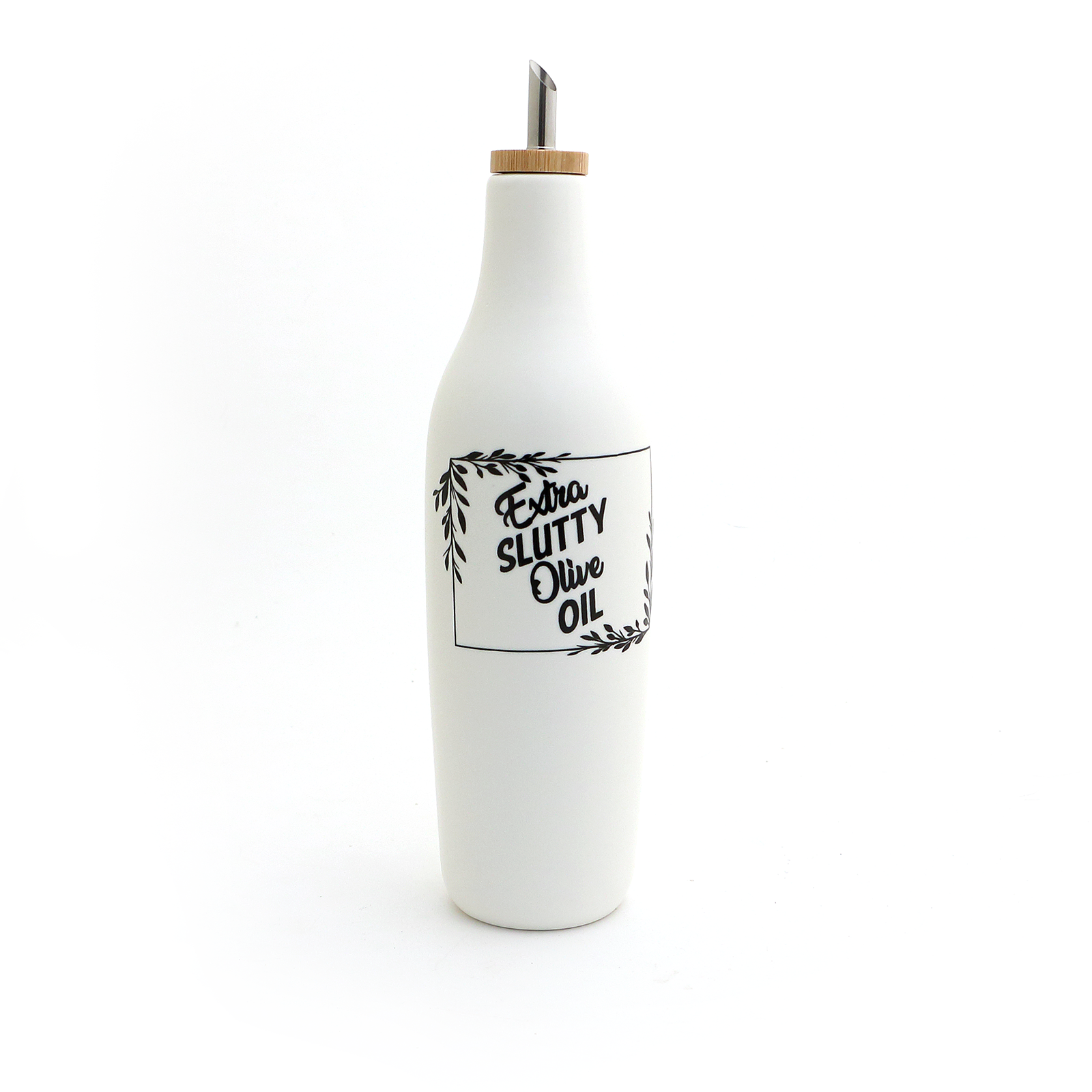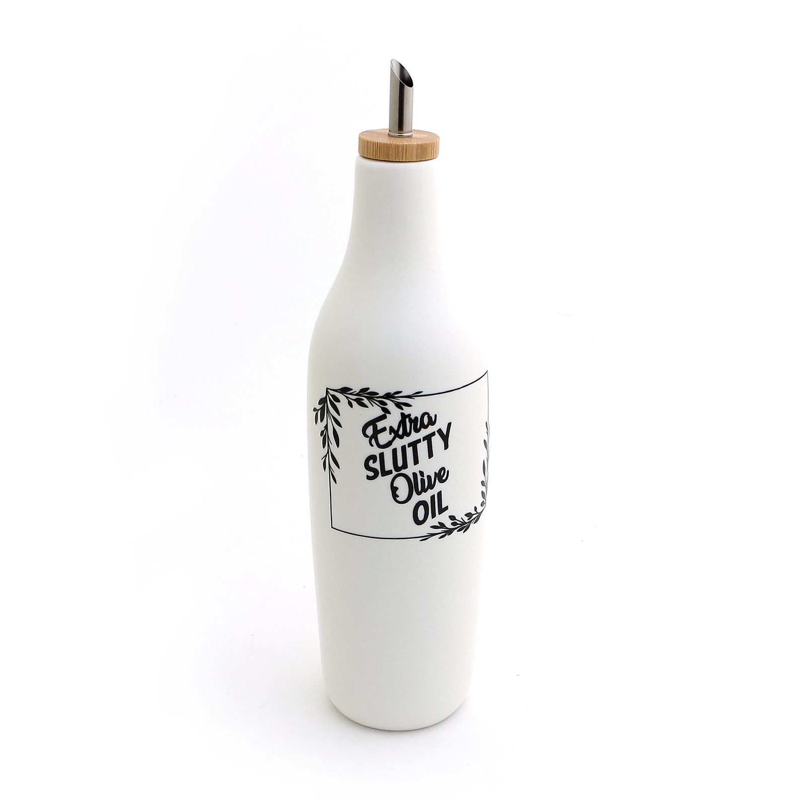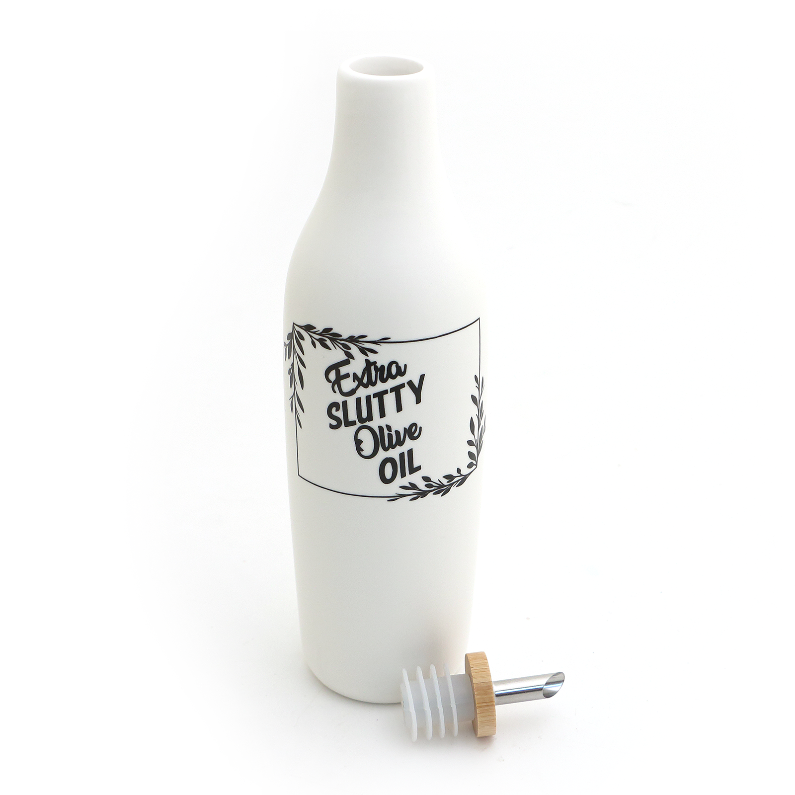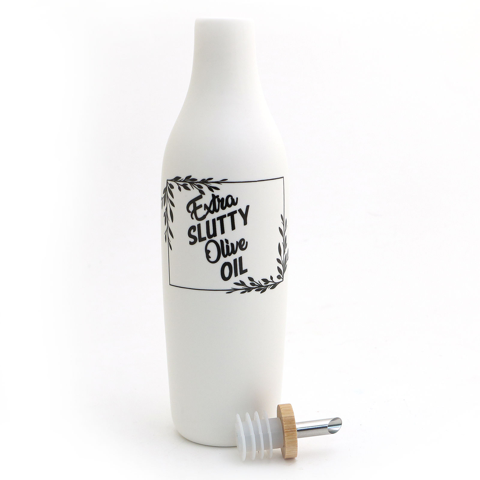 Extra slutty olive oil bottle, ceramic olive oil dispenser, -great gift for a foodie or salad lover with a sense of humor! This handmade ceramic bottle makes dispensing oil for salads, recipes, dipping dishes, etc., a breeze. The metal top adds a bit of sophistication, and fits snuggly in the top section of the dispenser. All lead free glazes were used, and the item was kiln fired to over 1900 degrees. Safe to place in the dishwasher. Made to be used and enjoyed! Measures 3.5"W x 10.5"H. Holds 16.9 oz of liquid.Great hostess gift. Matching dipping tray available in another listing.
