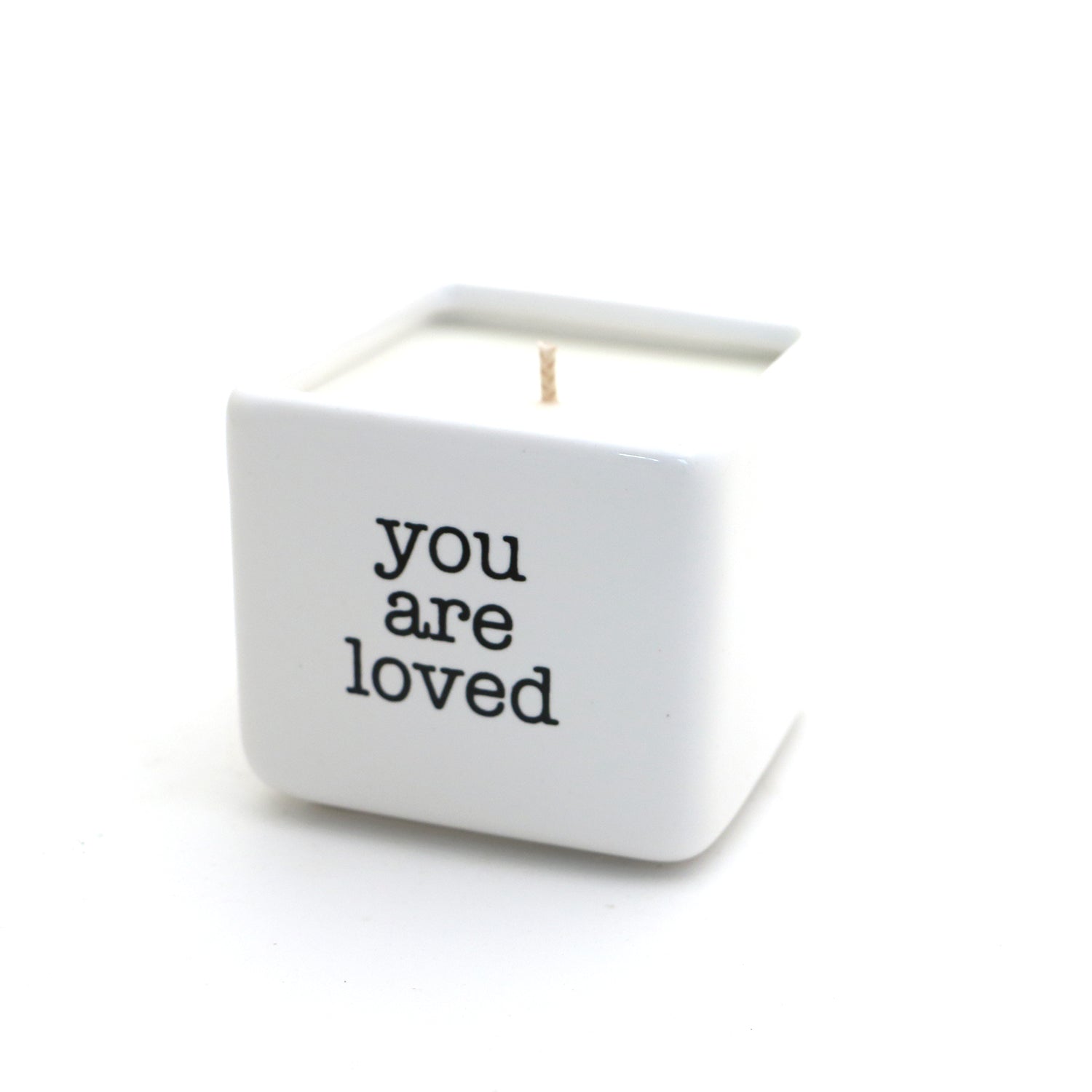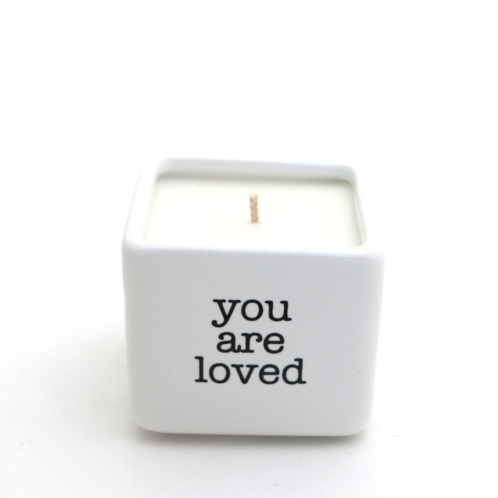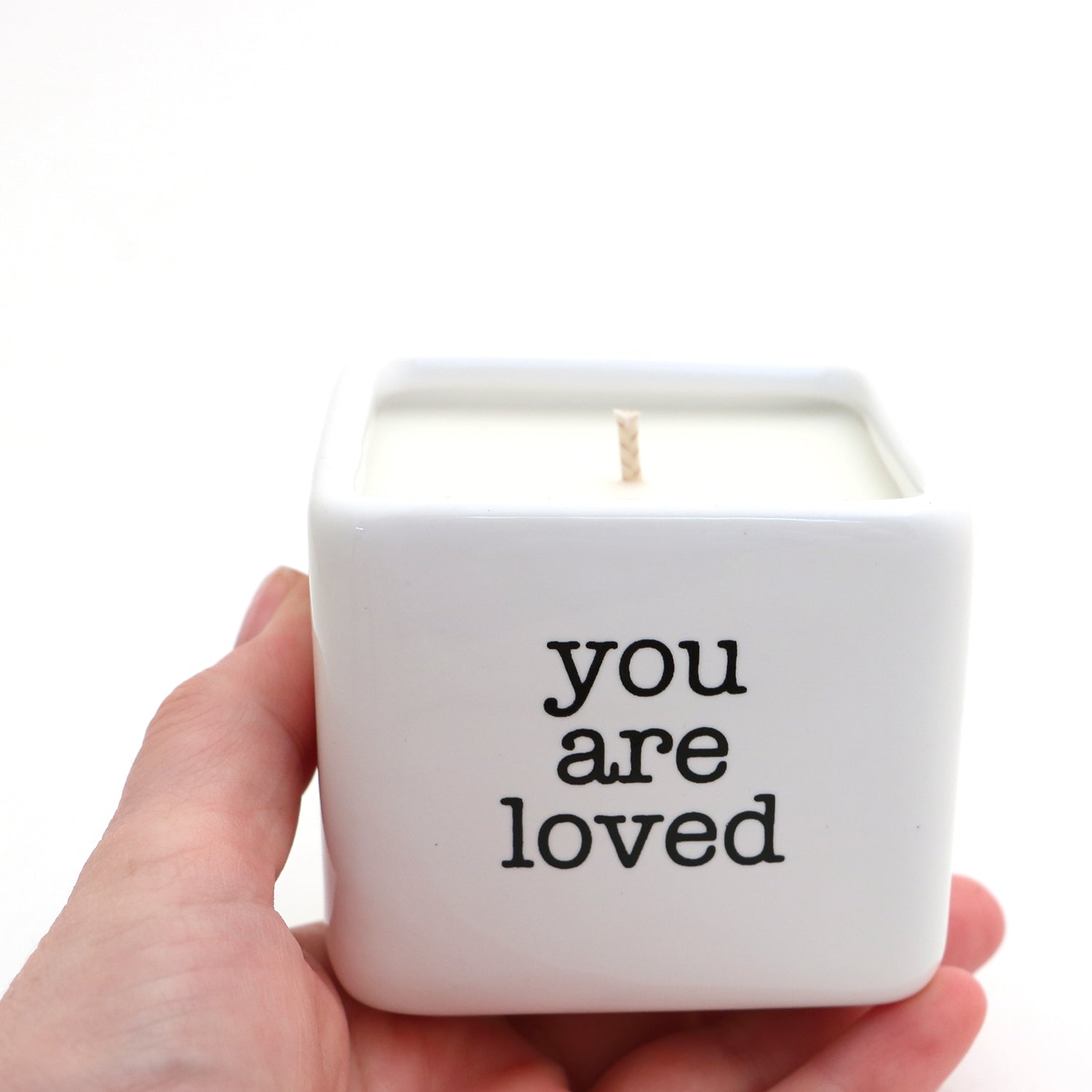 You are Loved candle is hand poured soy wax in an 8 oz. ceramic pot handmade from stoneware clay. It can be used as a planter once you have burned through your candle. It measures 3 x 3. Candle is unscented soy wax with a cotton wick for clean burning and long lasting flame. This is a simple but powerful gift to show someone how much you care about them. Inspires and encourages.