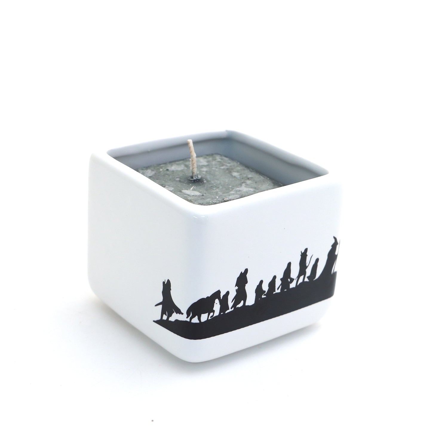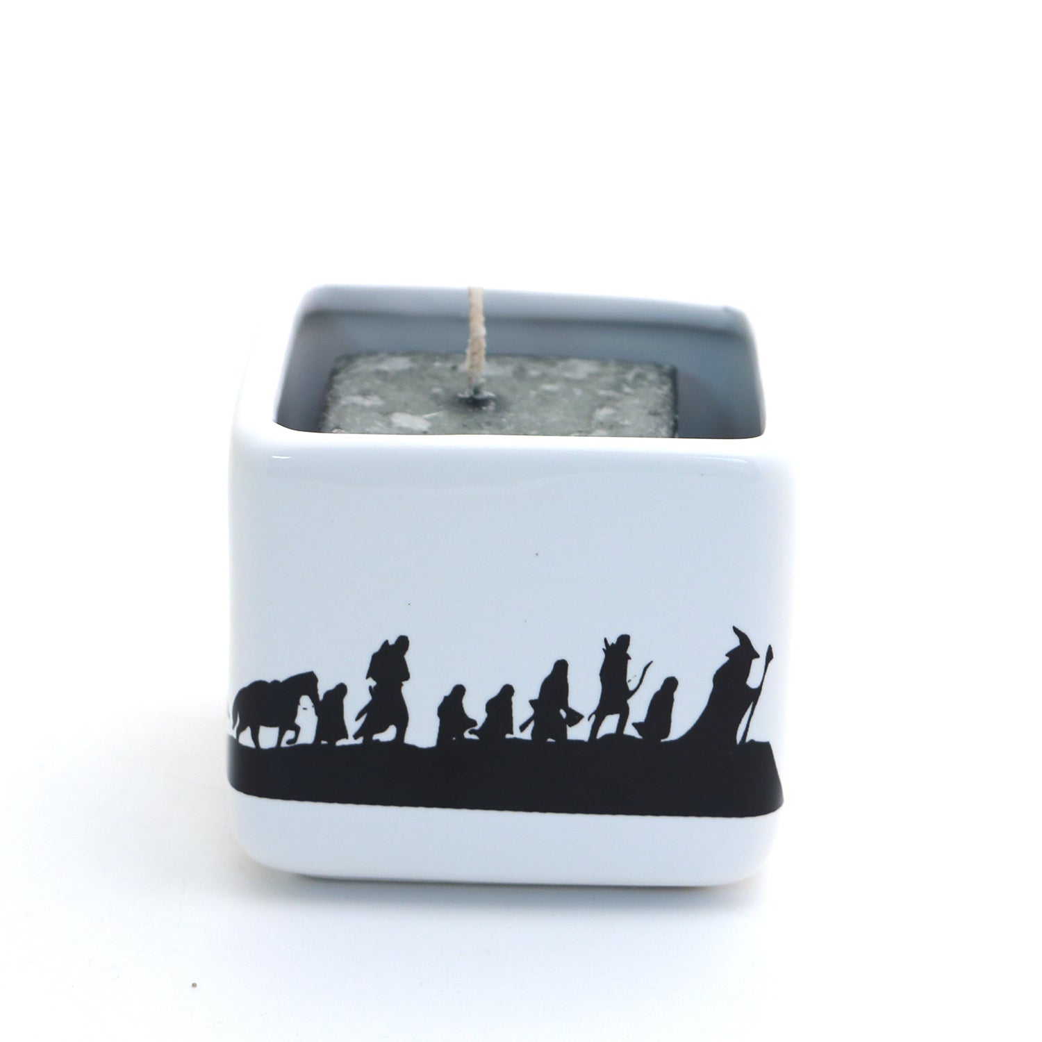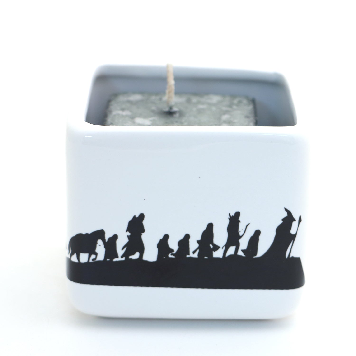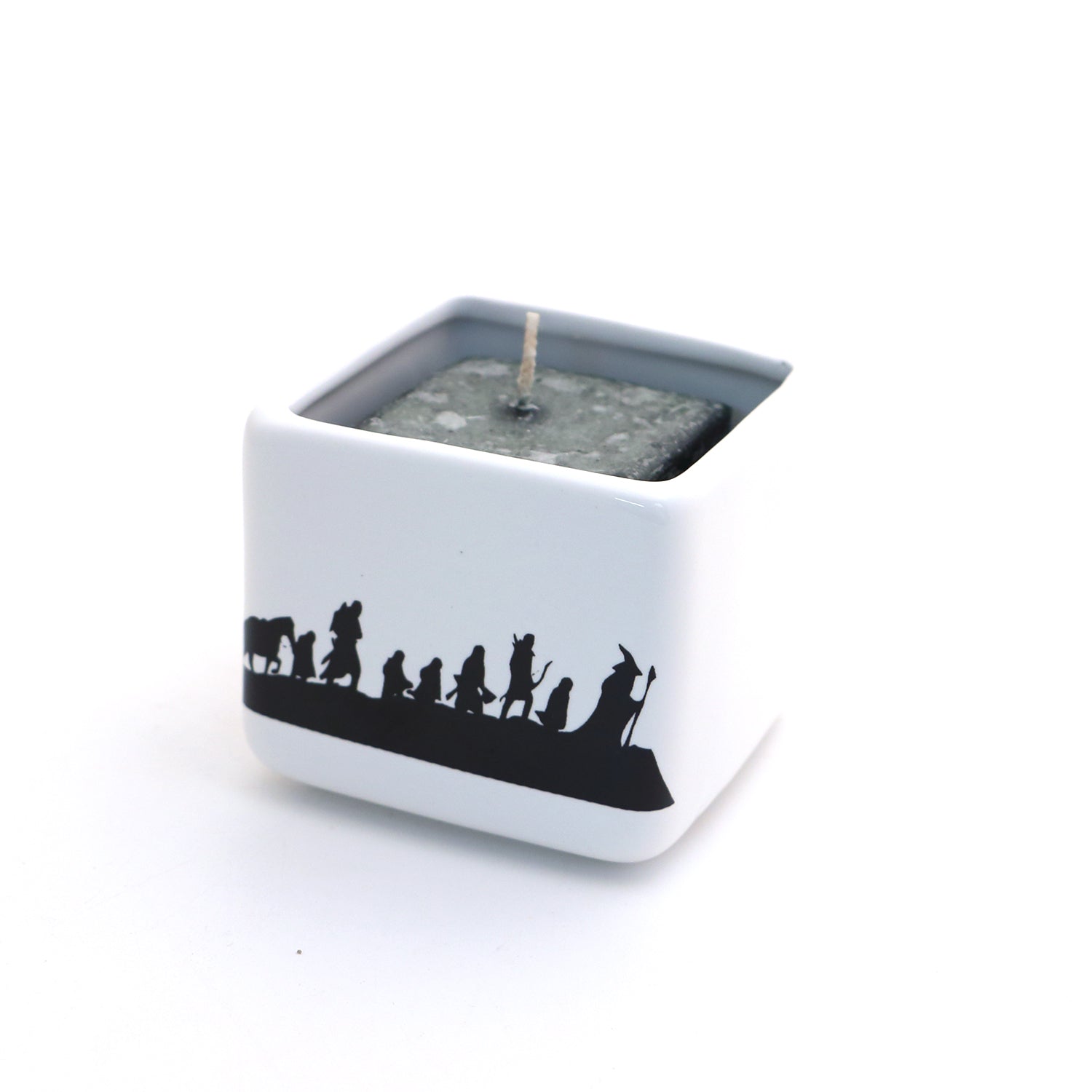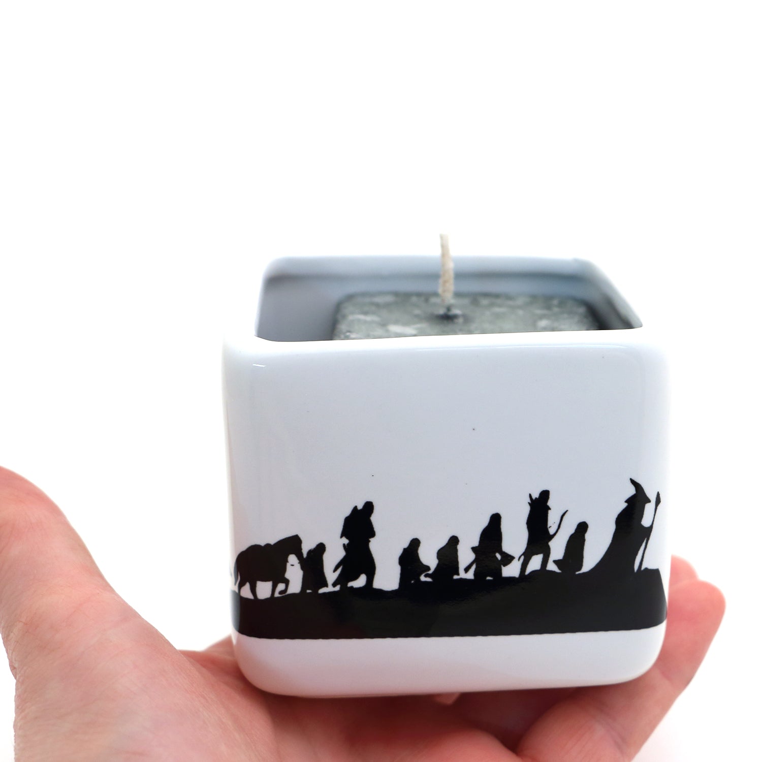 Fans of the Tolkein classics will enjoy this candle holder featuring the whole gang from Lord of The Rings. It measures 3 x 3. Handmade ceramic. A pine scented square shaped candle is included with purchase. Great gift for a reader or fantasy fan.