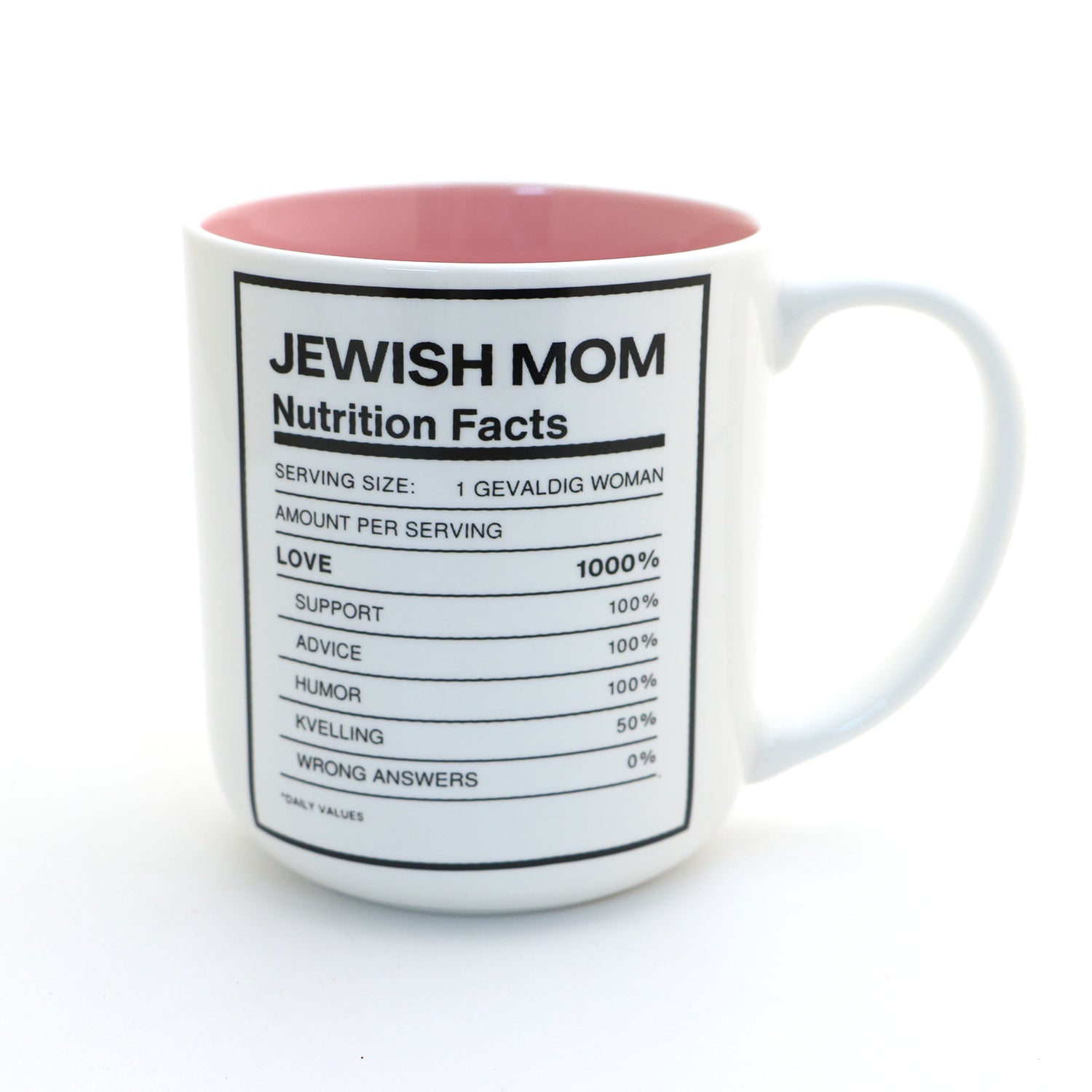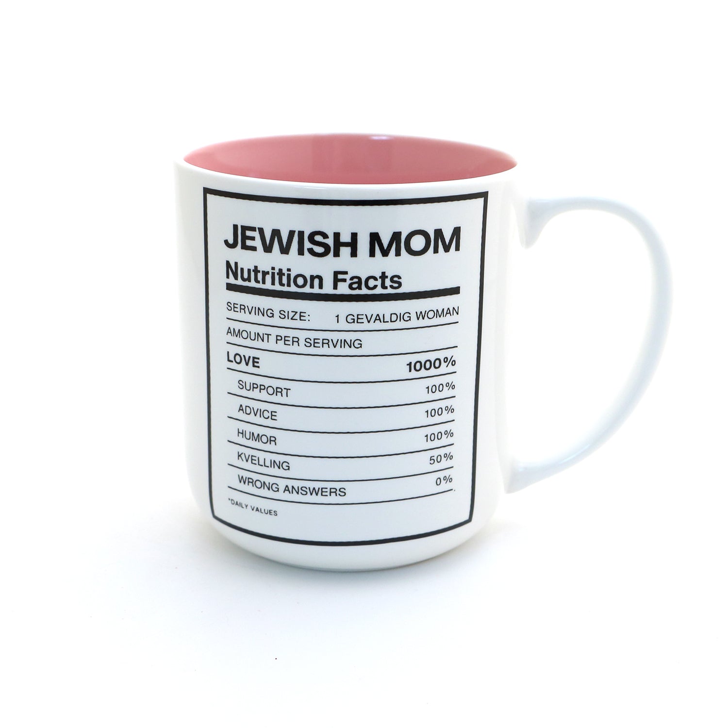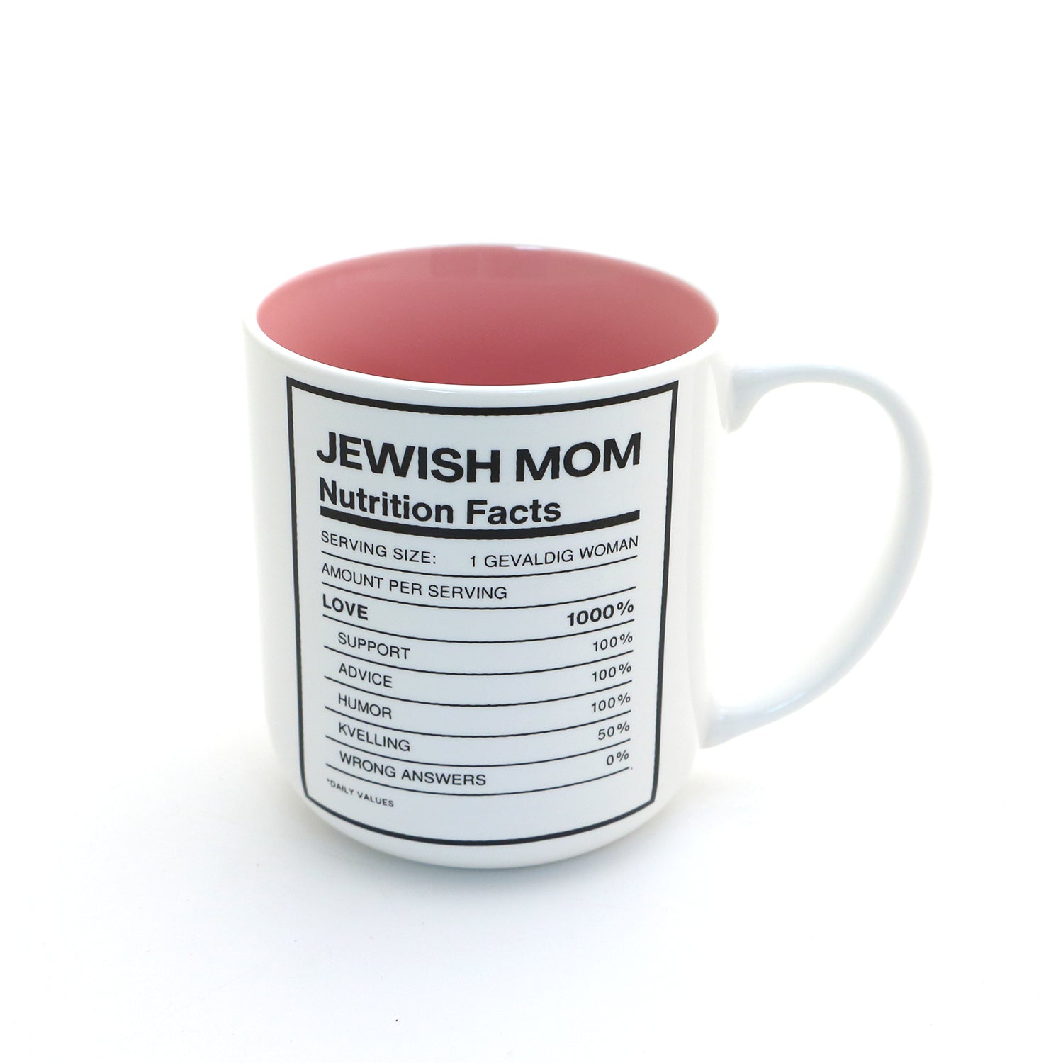 Jewish Mom mug lists all the ingredients that make up an amazing woman.  Back is blank.  Part of a fun and functional collection of unique Judaica pieces. Handmade from bone china clay, and kiln fired to over 1900 degrees. This mug measures 3.75 x 5.5 x 4.25 and holds 16 oz. - safe to place in the dishwasher or microwave. Great gift for Mother's Day.