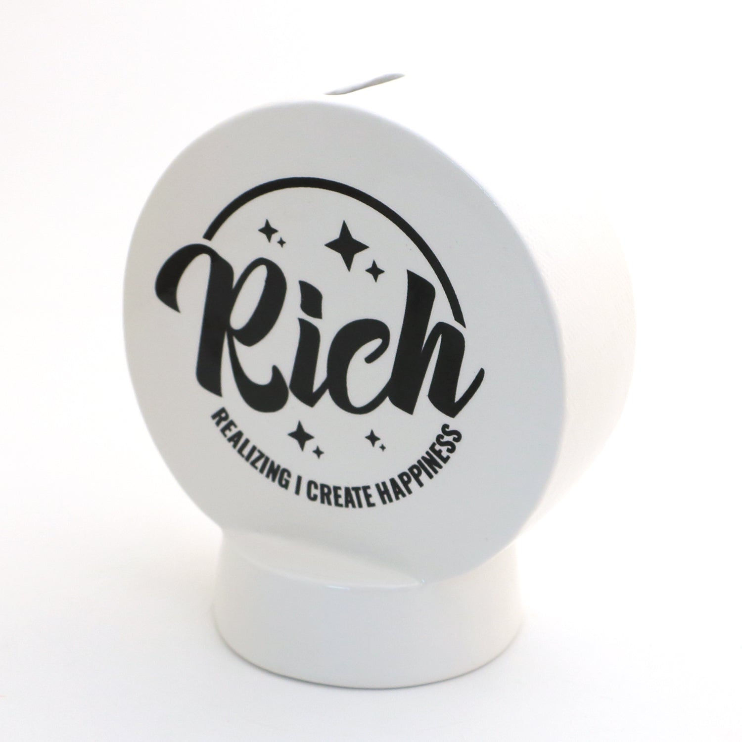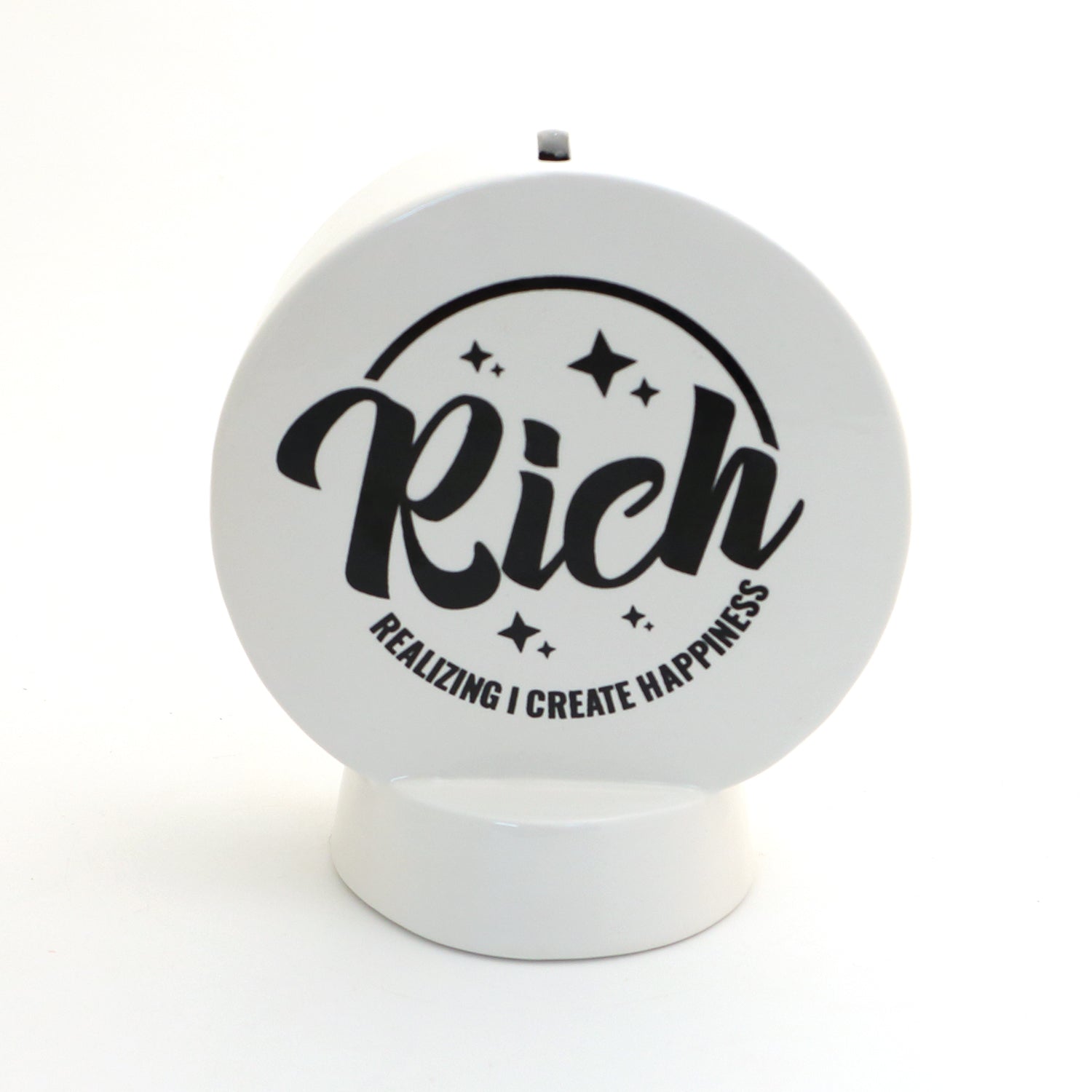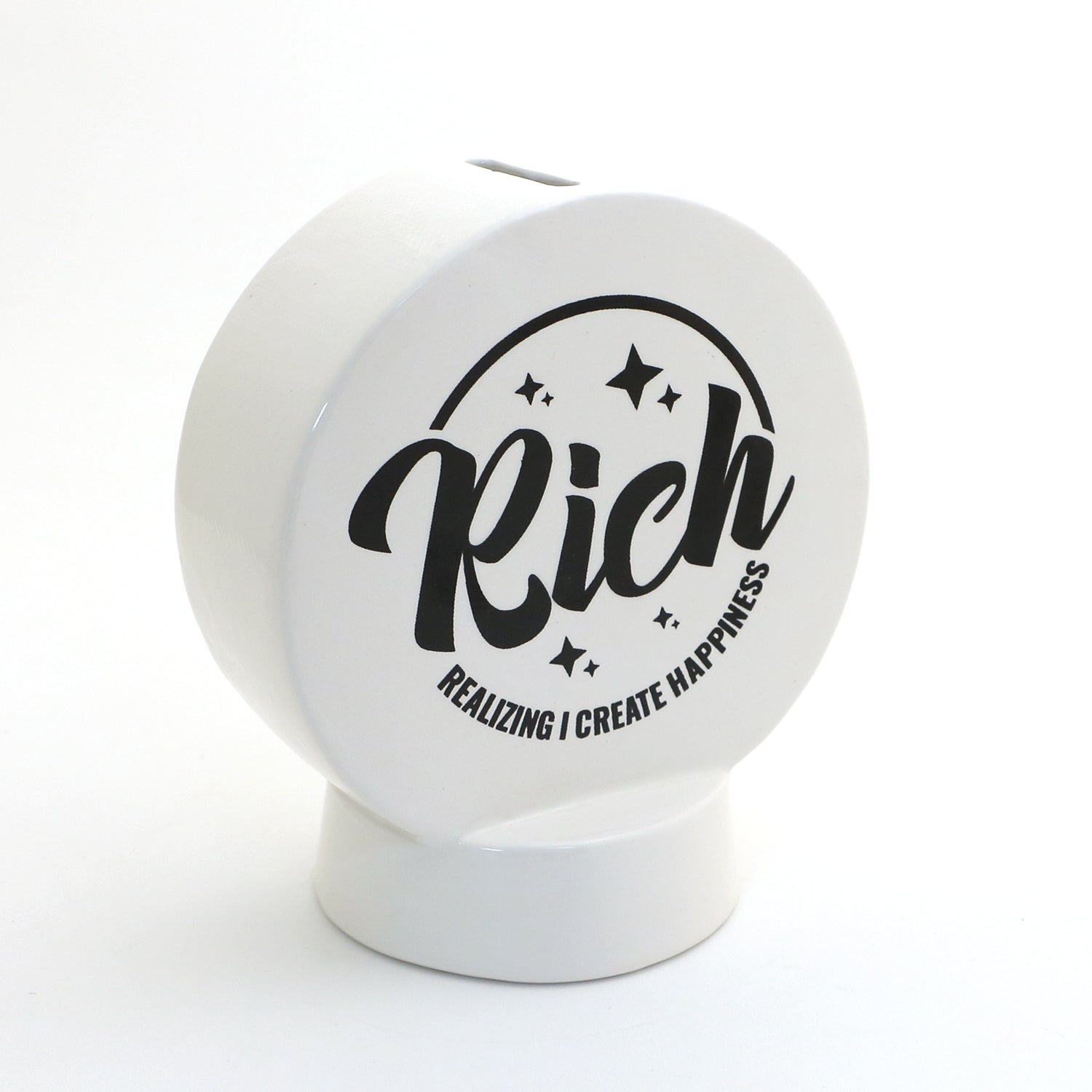 Handmade ceramic bank reads RICH (Realizing I Create happiness) and makes a great gift for anyone aware of what really makes you wealthy in life. Handmade from earthenware clay and kiln fired, this bank measures 6 inches high and the disc portion is 2 inches wide with a hollow base that is 3 inches. Ships with removable rubber stopper. Unusual whimsical addition to any decor. Funny birthday or graduation gift.
