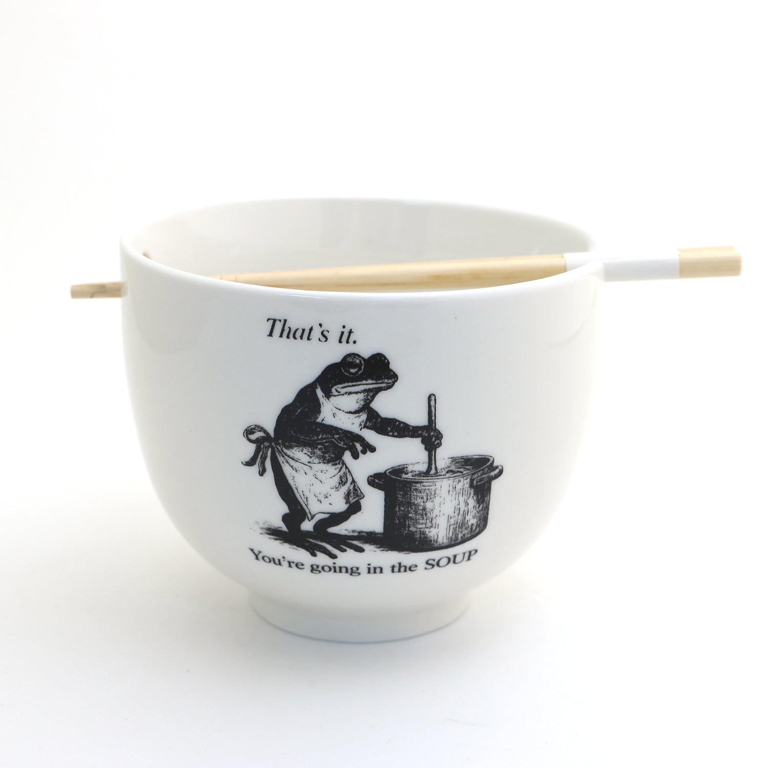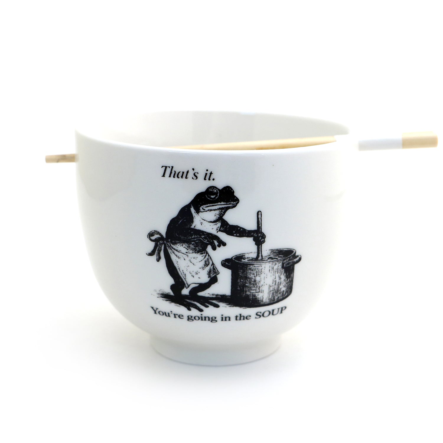 Frog noodle bowl with reusable chopsticks. Reads "That's it, You're Going in the Soup!" Great for ramen, pho, or take out. Created in my New Jersey studio from stoneware clay. Measures 5 x 4 and holds 20 ounces. Has two cut outs on rim to rest chopsticks. Made from lead free, eco friendly materials- kiln fired twice to 1900 degrees. Safe to place in the dishwasher and microwave. Made to be used and enjoyed. Gift boxed.