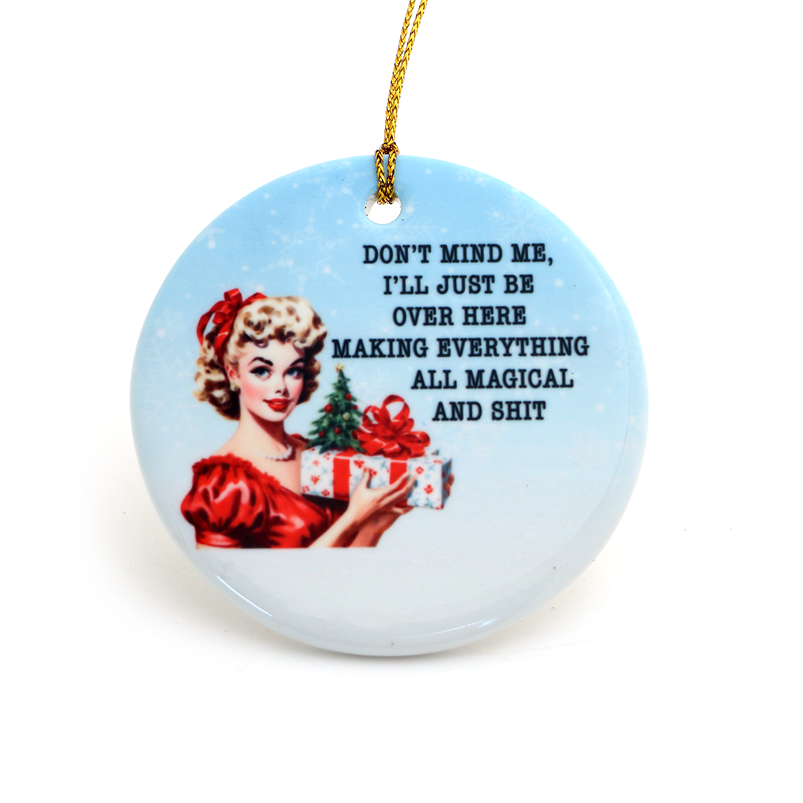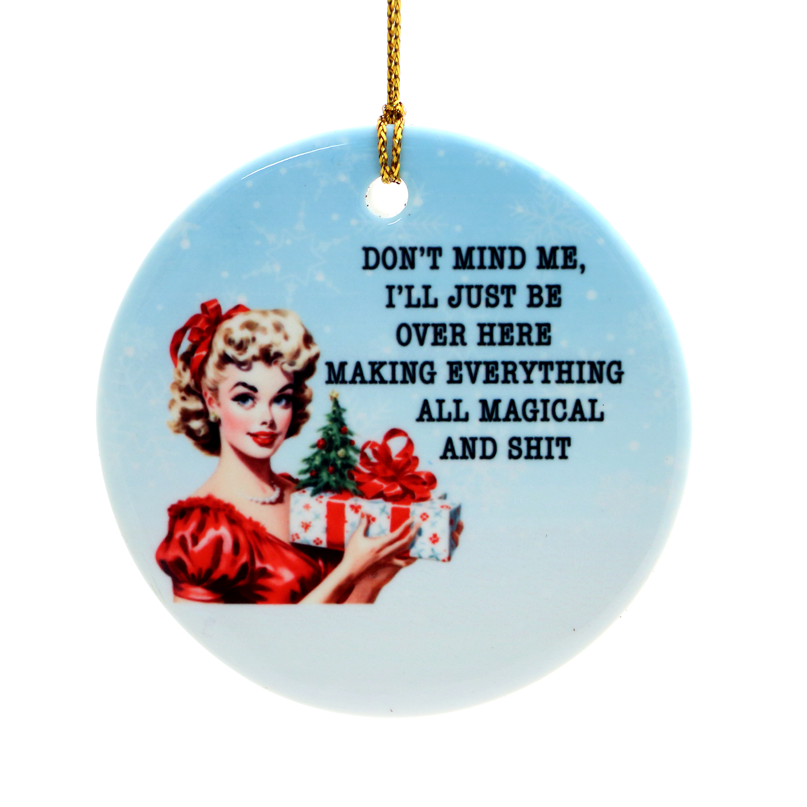 Some of us just do more during the holidays. Ornament reads "Don't mind me, I'll just be over here making everything all magical and shit." This ornament is made of porcelain clay, is flat and measures 3" x 3". It comes in a small gift box, making it a great gift.
