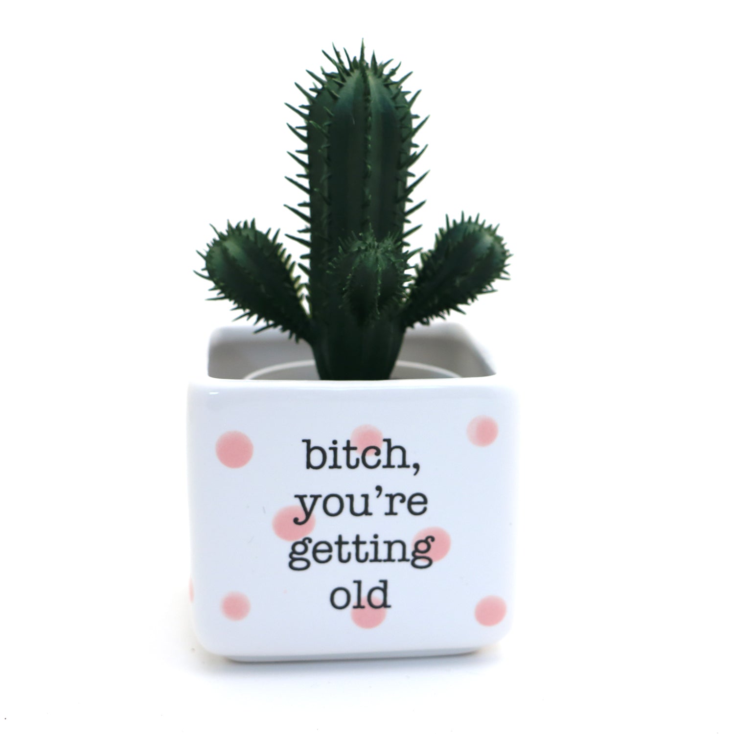 Bitch You're Old- the truth makes a great (and funny) gift for any milestone birthday. Mini square pot can be used for a small plant or succulent (no drainage hole in this item) or candle holder. It measures 3 x 3. Handmade ceramic. PLANT NOT INCLUDED. You can add a white ball candle to this and use as a refillable candle holder- click on the add candle option.