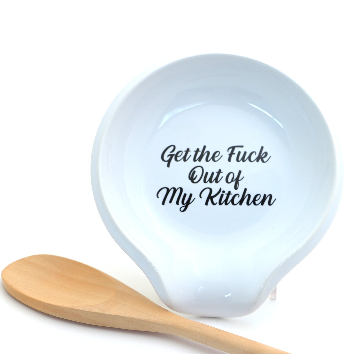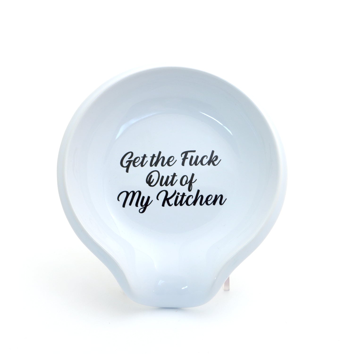 Ceramic spoon rest reads "Get the Fuck Out If My Kitchen" and is the perfect gift for anyone who takes cooking VERY SERIOUSLY. This plus holding a steak knife casually in your hand should clear the room so that you are free to concentrate on concocting your epicurean masterpiece! Handmade ceramic spoon rest that I have created from stoneware clay kiln fired three times to over 1900 degrees. This spoon rest is safe to place in both your dishwasher and microwave. It is made from 100% lead free, non toxic materials. It measures 5 x 1. Made to be used and enjoyed!