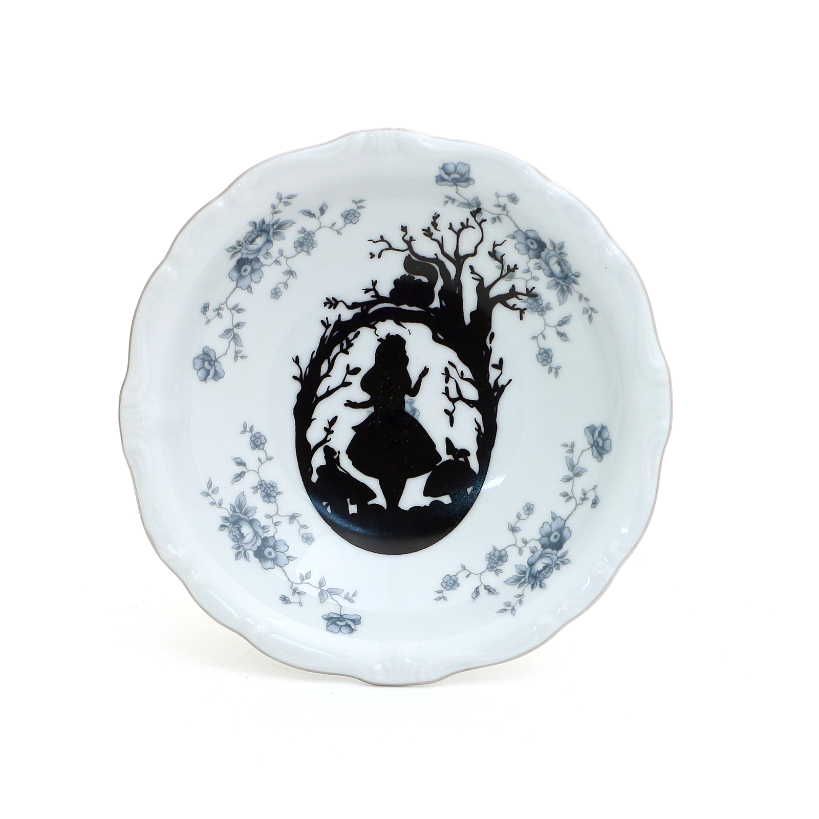 Fans of Alice in Wonderland and the books by Lewis Carroll will enjoy this upcycled vintage dish which features the silhouette of Alice in a woodland hollow, surrounded by dainty flowers. This is a vintage piece that has been restored and altered. Limited quantities available. Kiln fired. Measures 5 x 1. Can be used as a spoon rest, serving dish or jewelry holder.