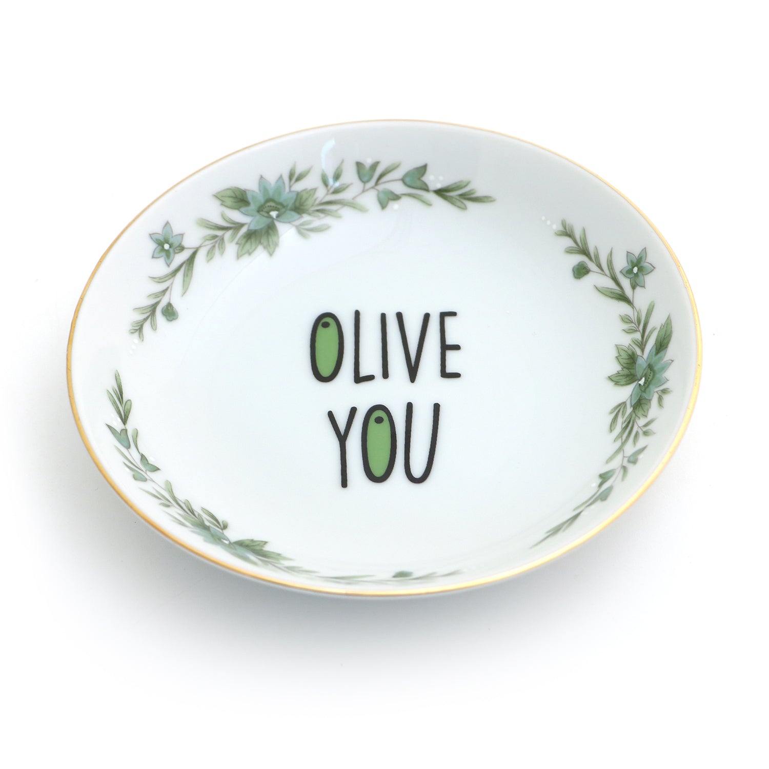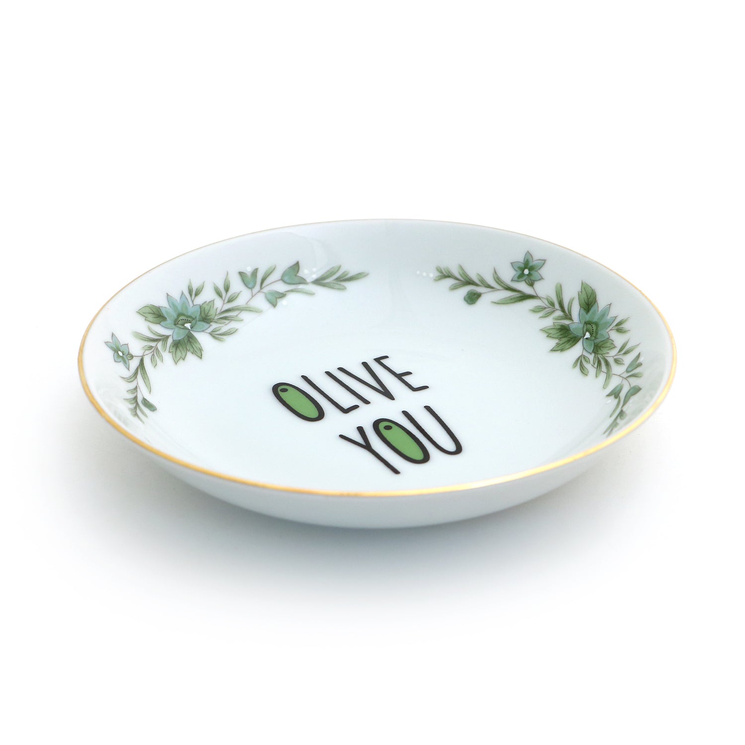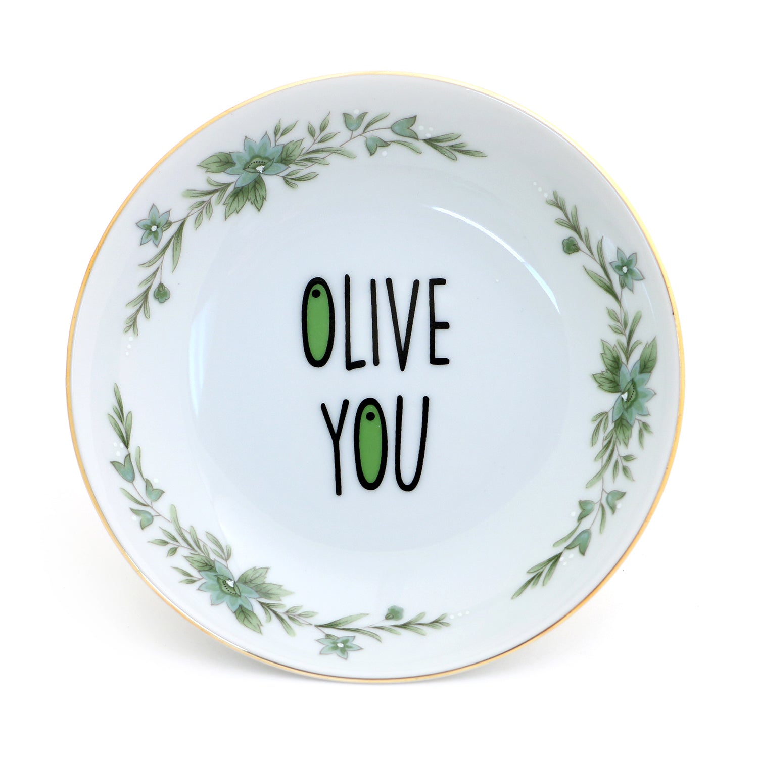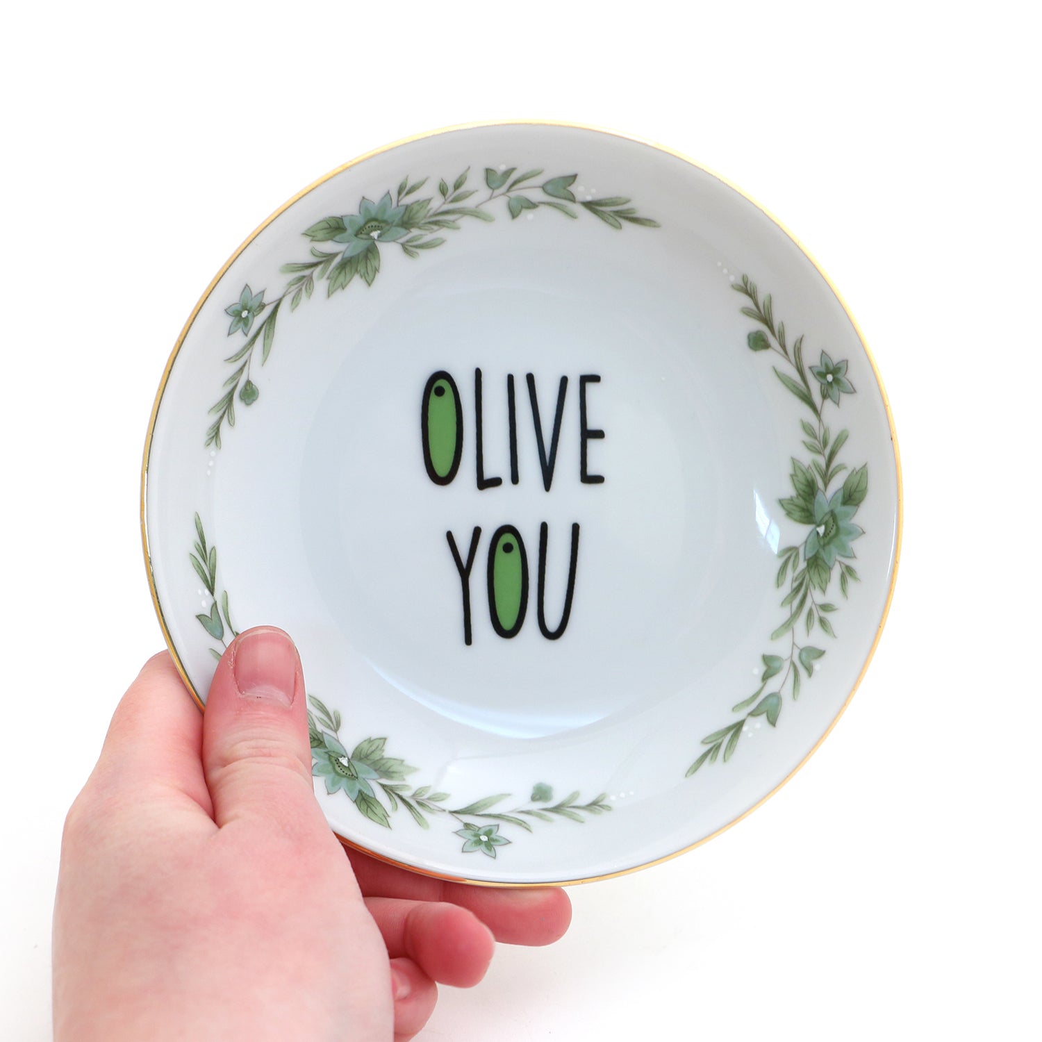 Olive you! I also love dipping a crusty bread into a tasty olive oil- and this little dish is the perfect place to pour that golden goodness. If you are not a fan of dipping this plate is also the perfect size to keep pits or olives. I have restored and altered this upcycled vintage bowl through numerous kiln firings- it features a 22K gold rim. Measures 5.5 x 1 inches. Great little hostess gift.