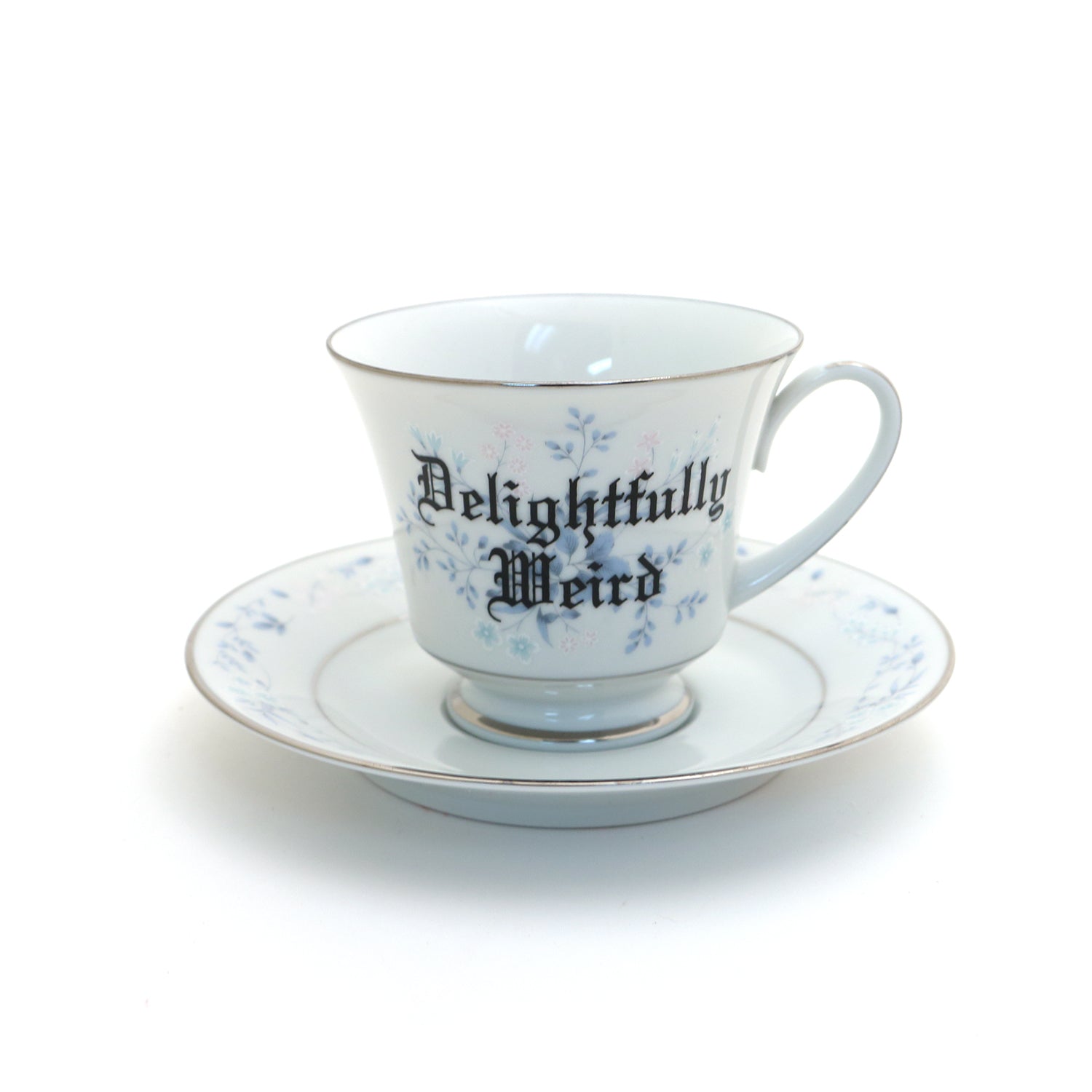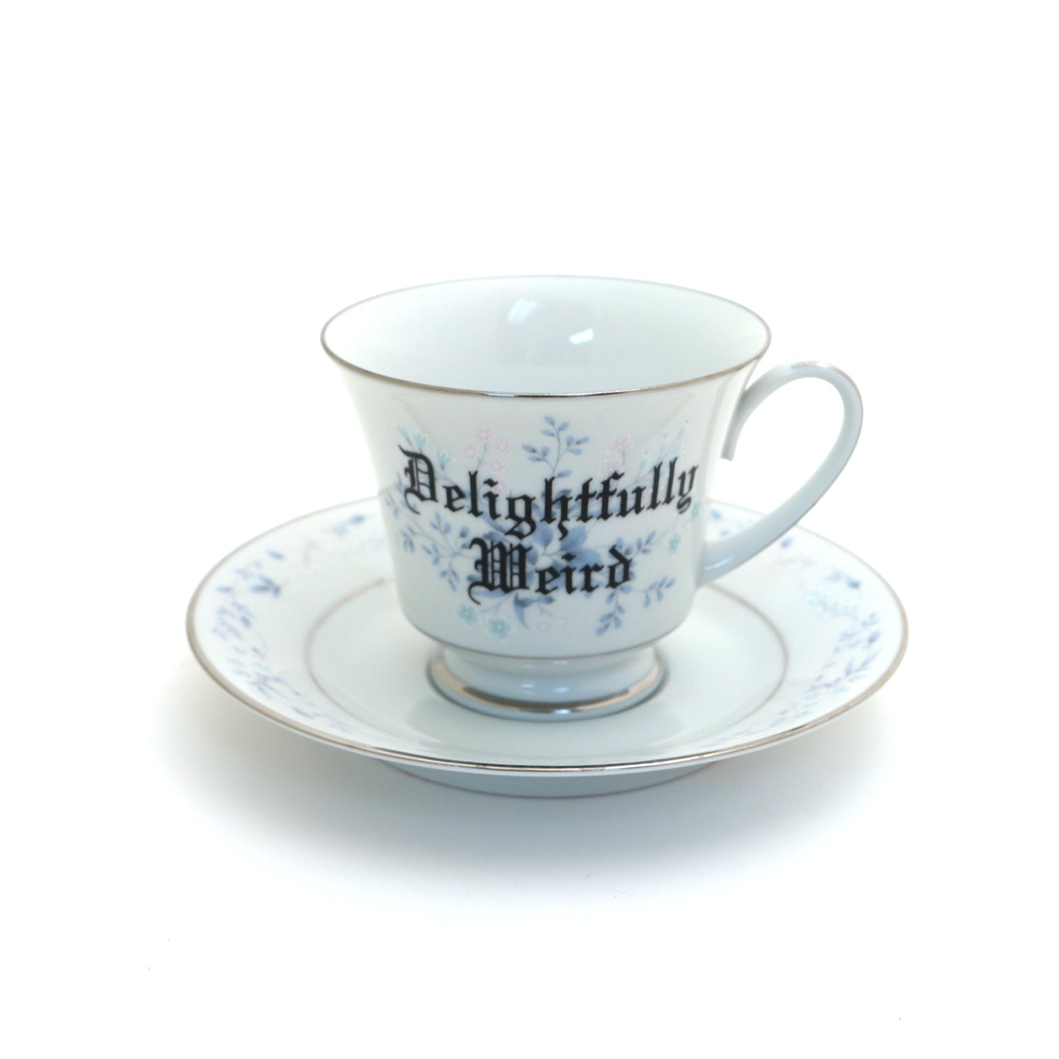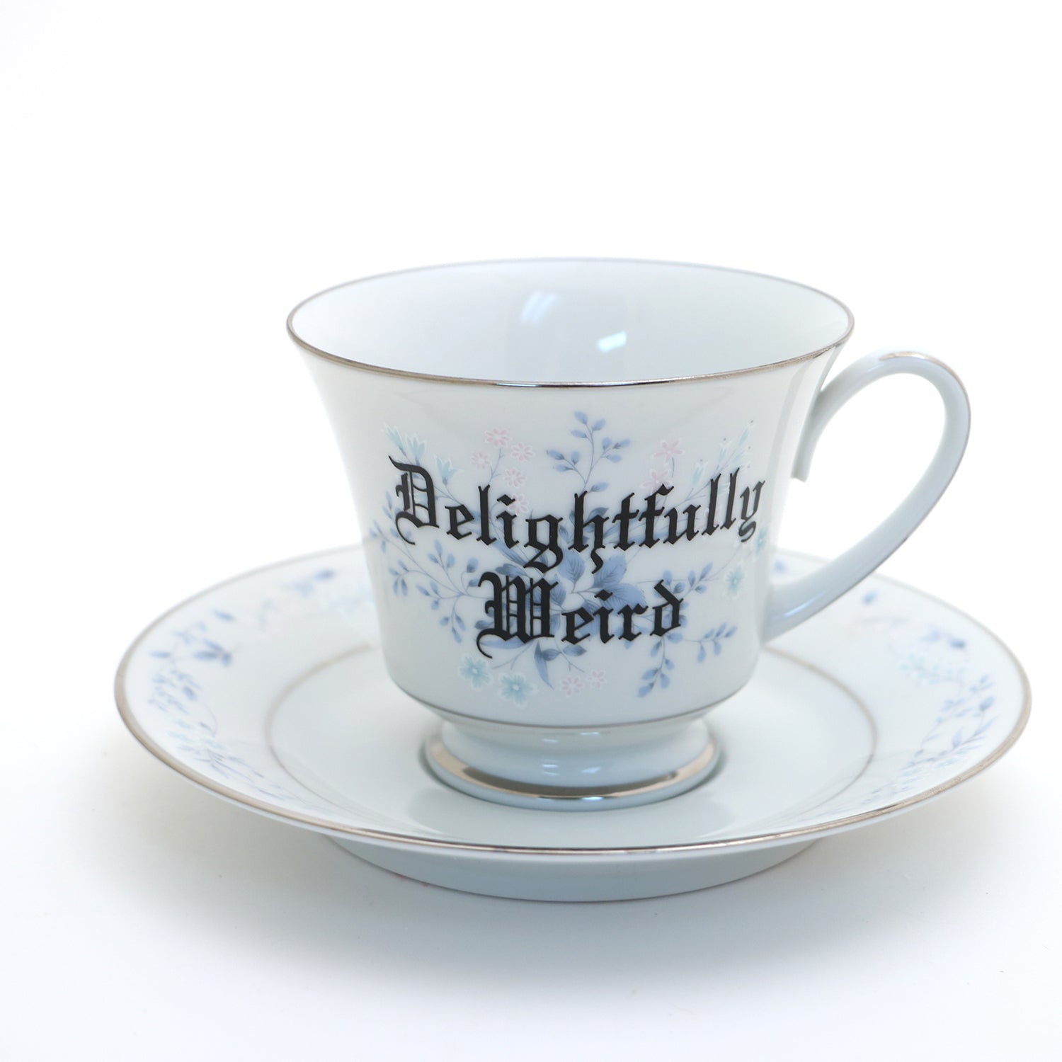 This upcycled teacup and saucer set features delicate blue florals and script and reads: Delightfully Weird which could describe an amazing friend or even yourself! Features metallic silver accents. Cup measures 3 x3 and holds 8 ox, saucer is 6 inches. This item was rescued, restored and altered through a ceramic process. Upcycling prevents items from going into landfills and provides them with a new life!Great gift for a tea lover or tea drinker because everything tastes better in a fancy cup!