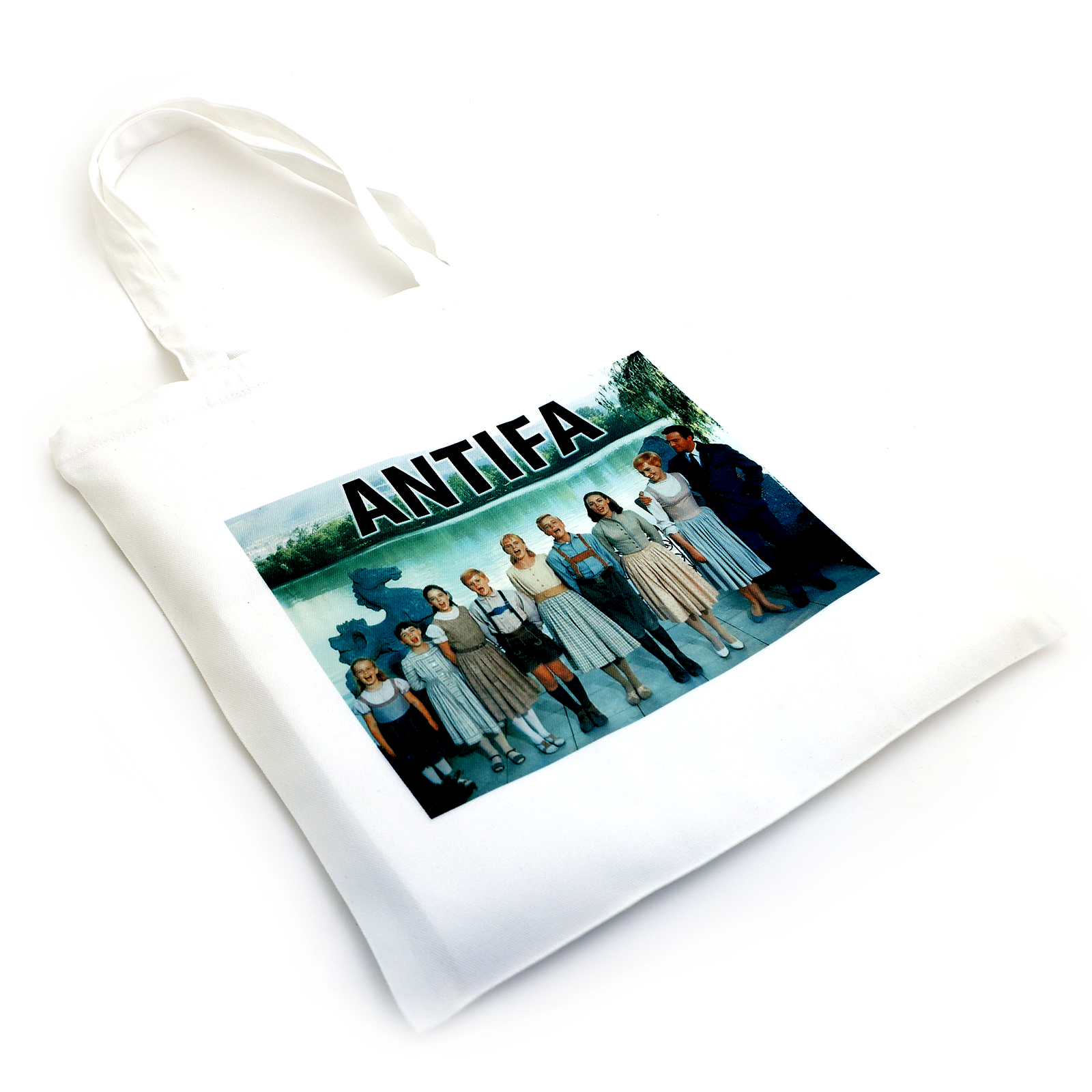 Funny gift for resister, anti-fascist or fan of the absurd. Antifa Tote. This tote has an image of the famous Antifa family the Von Traps with the word Antifa emblazoned across the top. Measures 14 inches wide x 15 inches tall. Handles are 8 inches long. Image is sublimated printed in our New jersey studio. Great gift for musical theater fan / anti fascist.