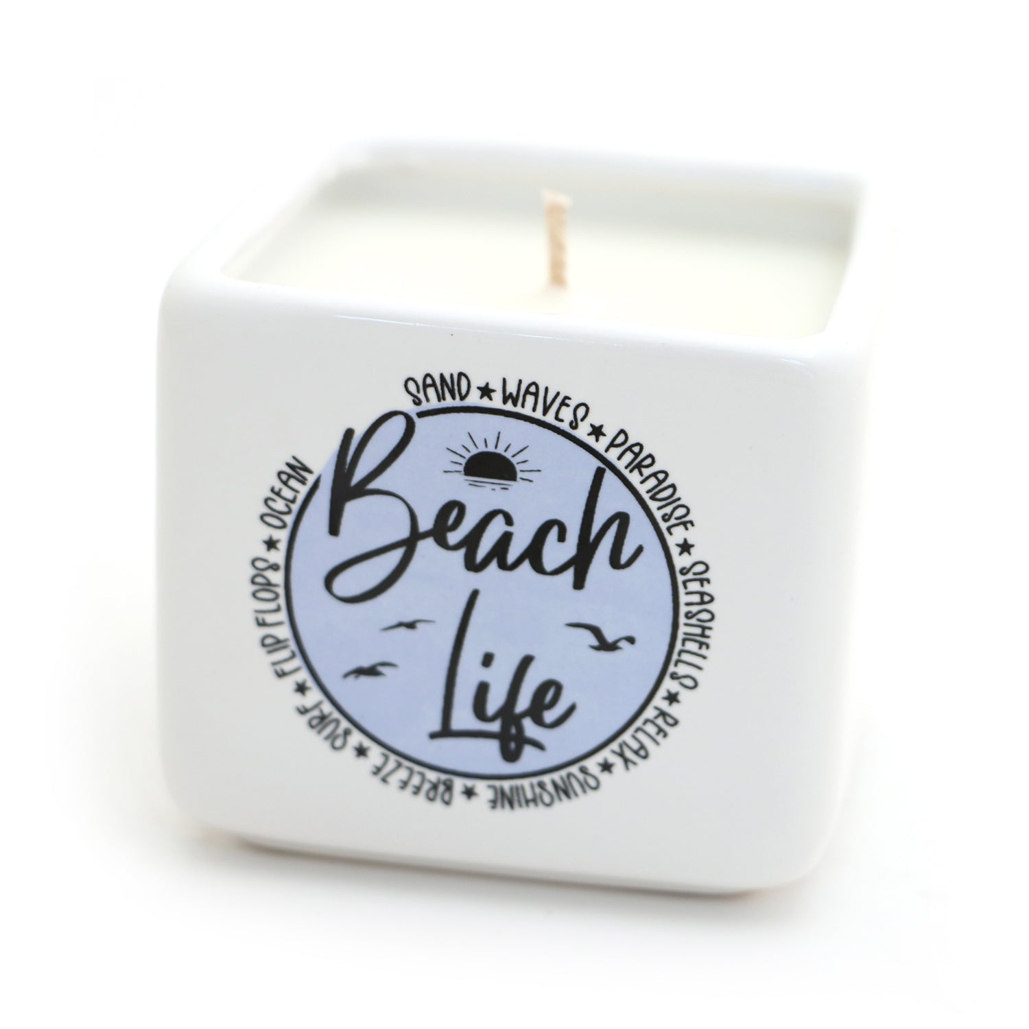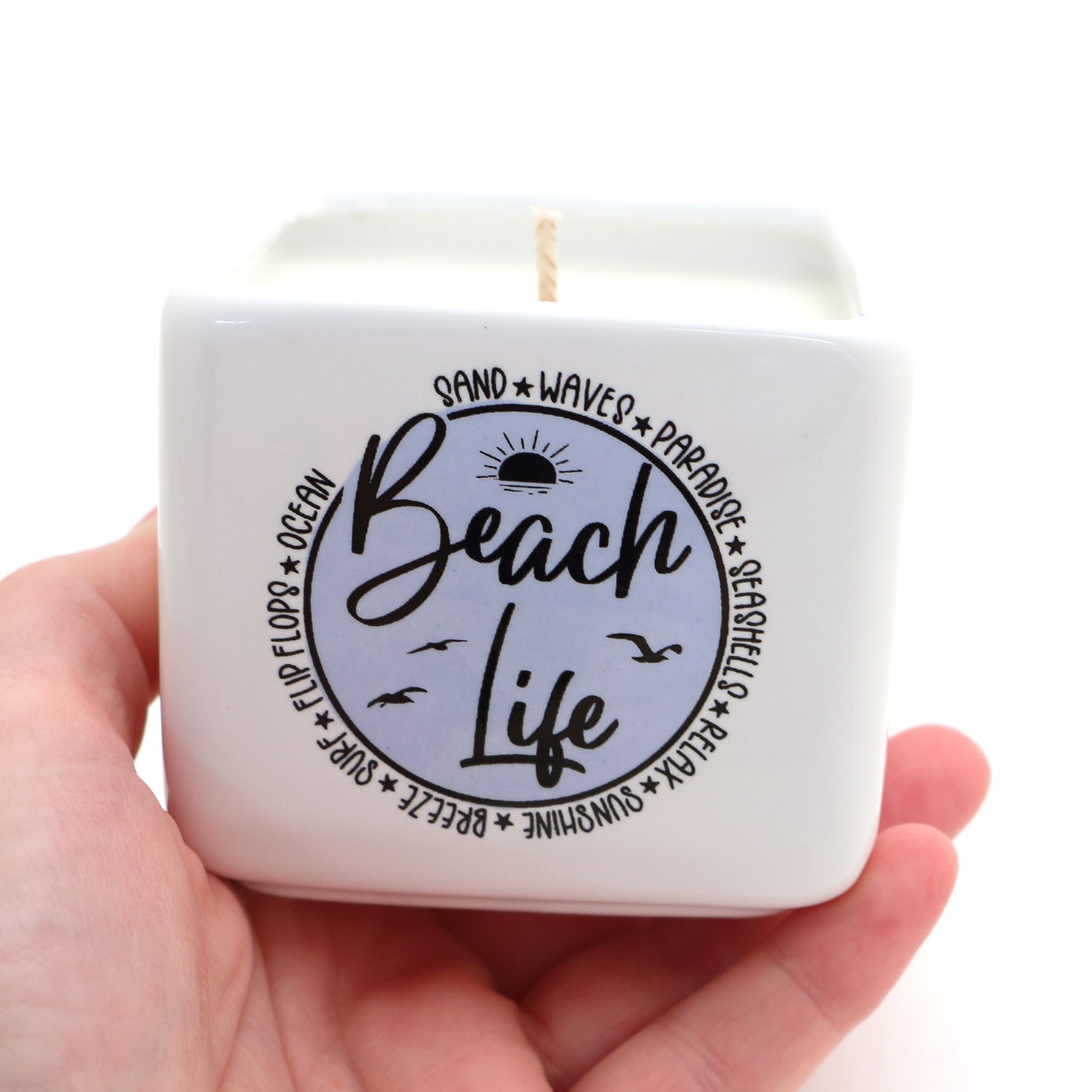 Beach Life candle celebrates all the joy of being near sand and sea. Handmade from earthenware clay, it can be used as a planter once you have burned through your candle. It measures 3 x 3. Candle is unscented soy wax. Great gift for an ocean or beach lover and the perfect hostess gift for a weekend at the shore.