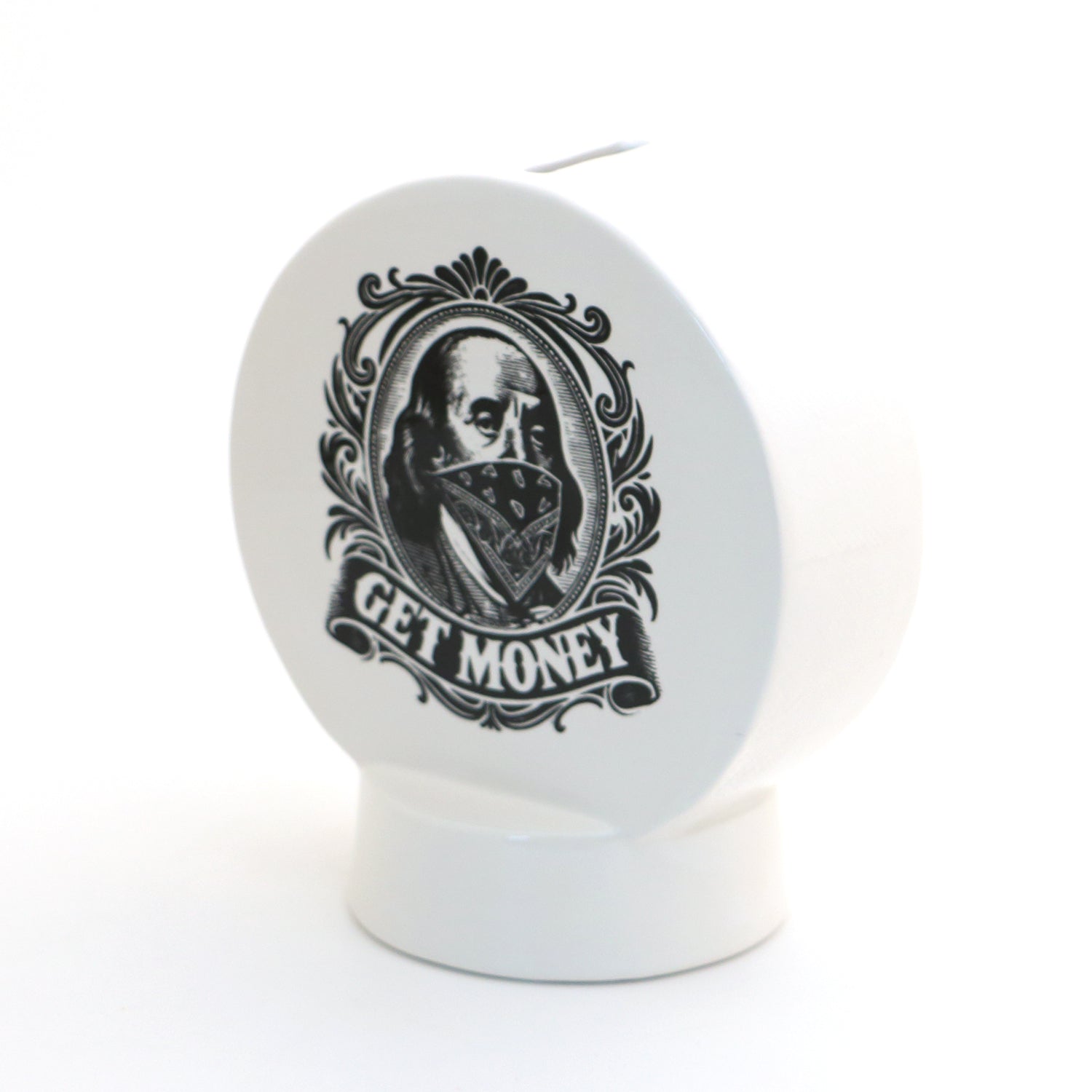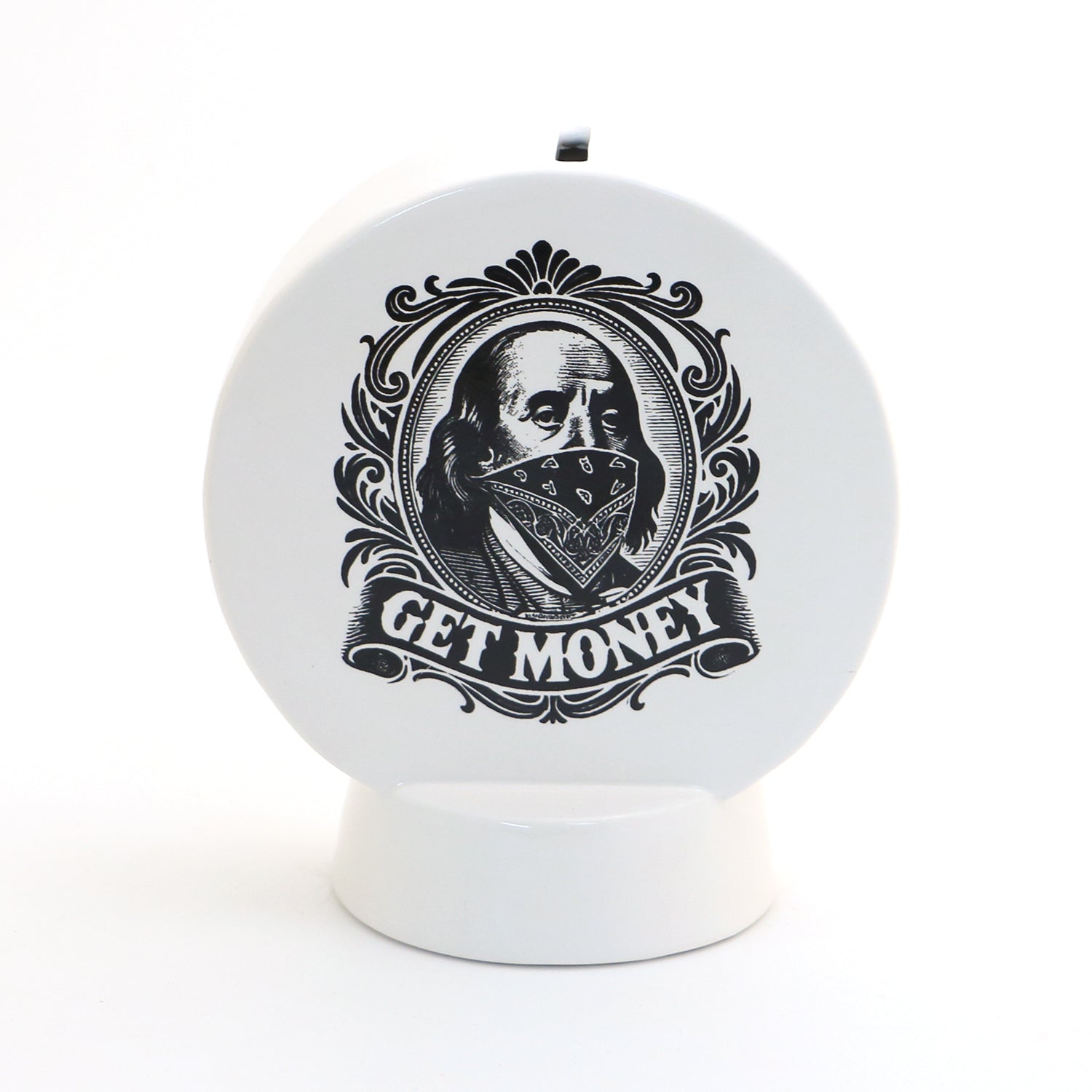 Handmade ceramic bank features Benjamin Franklin as a masked robber and the words Get Money. Motivate yourself to riches and make it rain dolla dolla bills! Handmade from earthenware clay and kiln fired, this bank measures 6 inches high and the disc portion is 2 inches wide with a hollow base that is 3 inches. Ships with removable rubber stopper. Unusual whimsical addition to any decor. Funny birthday or graduation gift.
