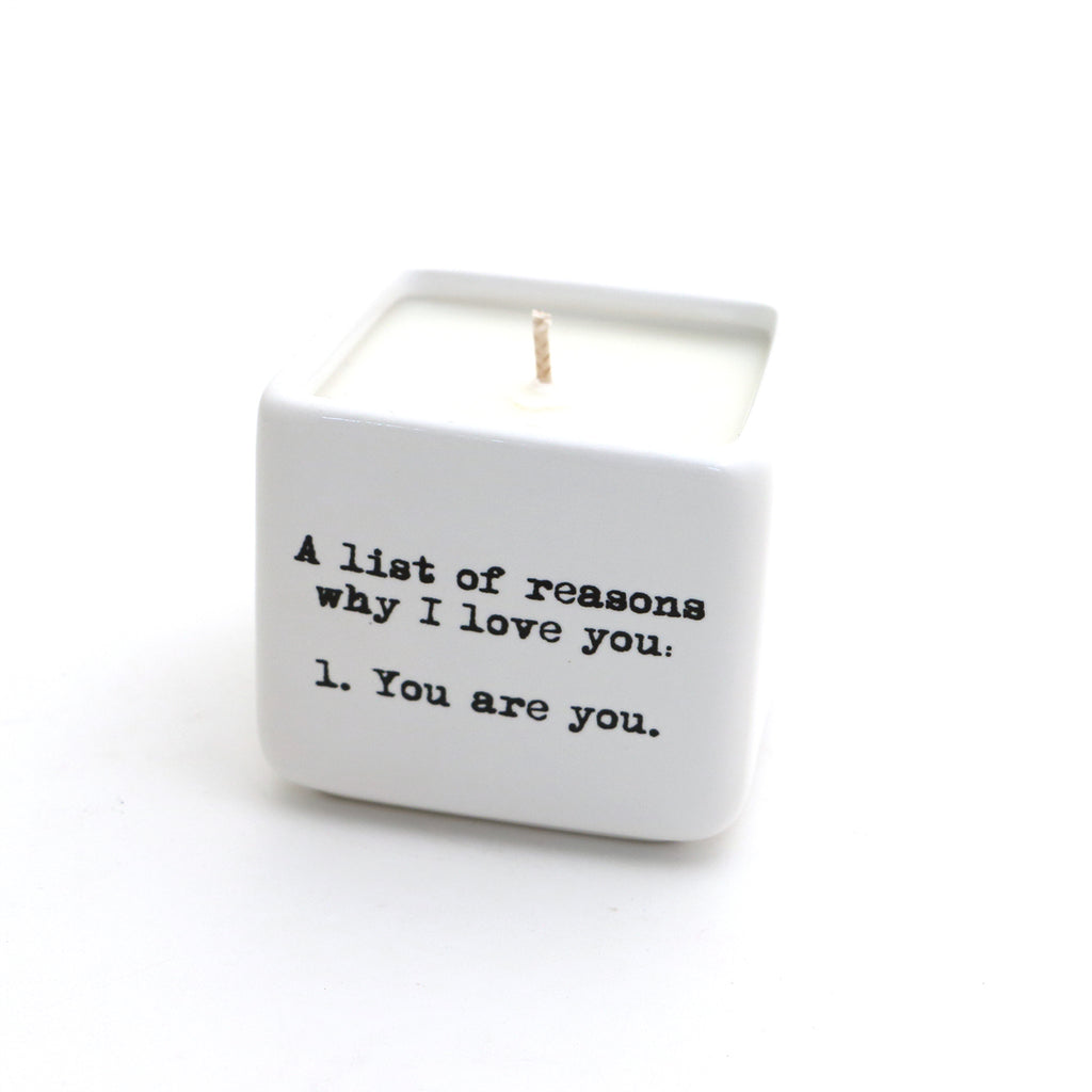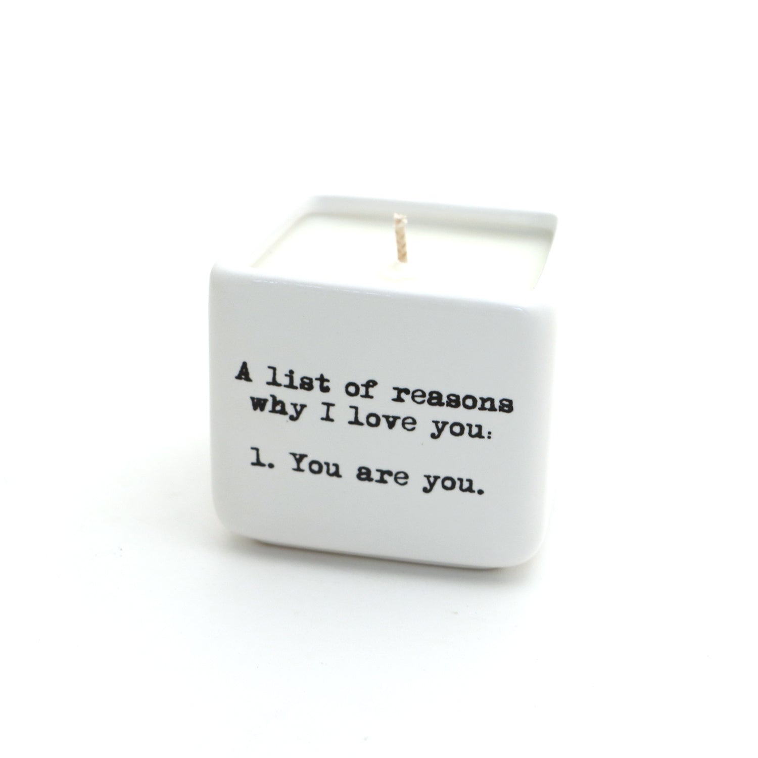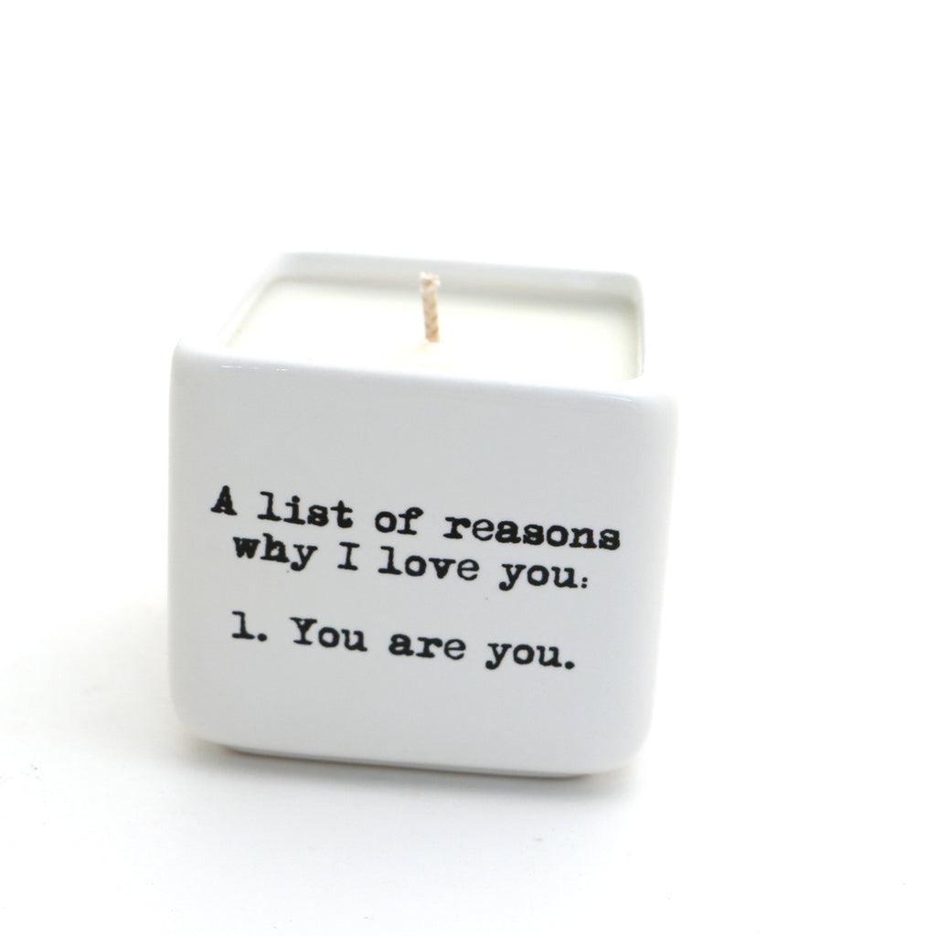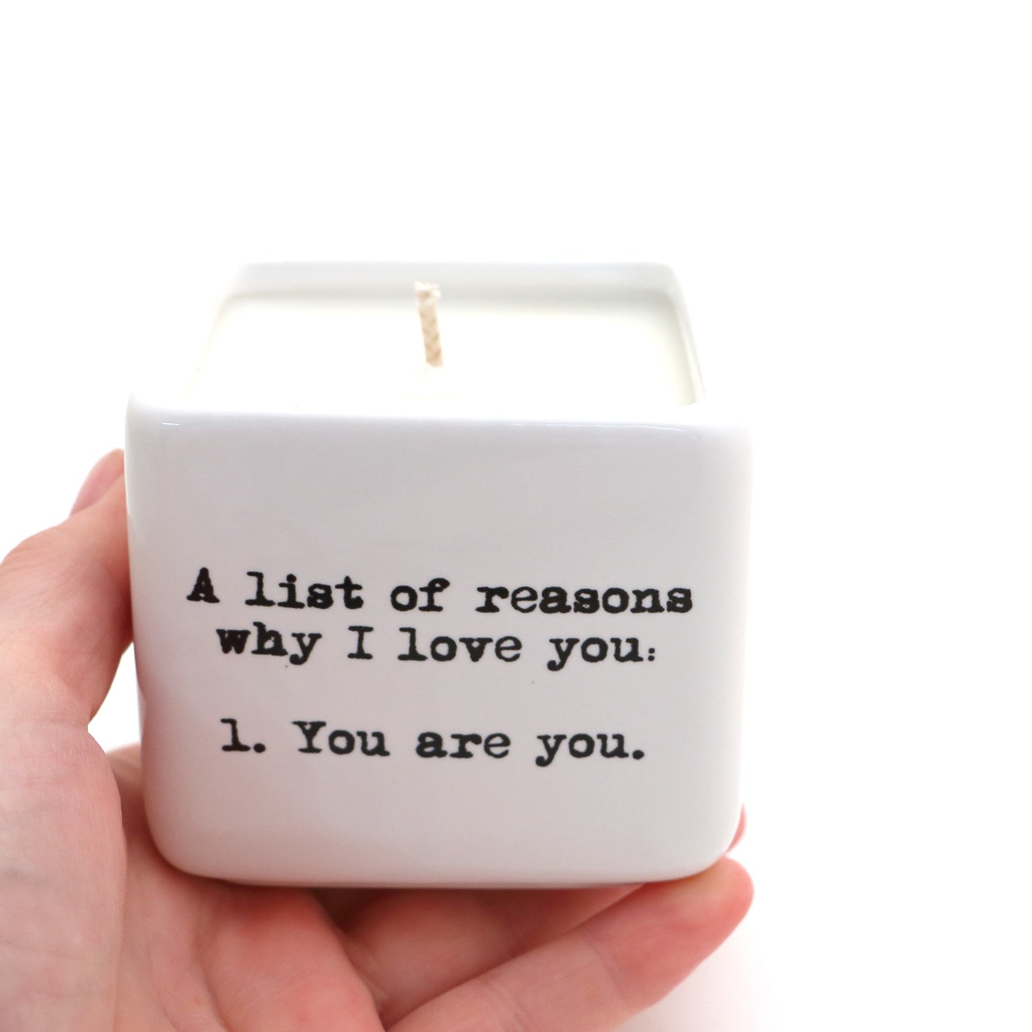 Reasons I Love You candle is hand poured soy wax in an 8 oz. ceramic pot handmade from stoneware clay. It can be used as a planter once you have burned through your candle. It measures 3 x 3. Candle is unscented soy wax with a cotton wick for clean burning and long lasting flame. This is a simple but powerful gift to show someone how much you care about them.
