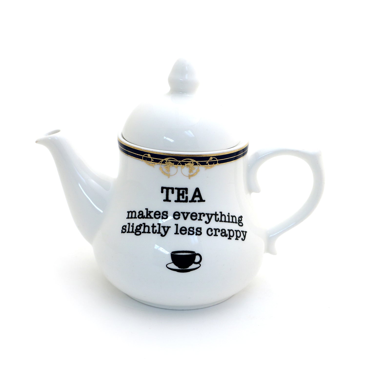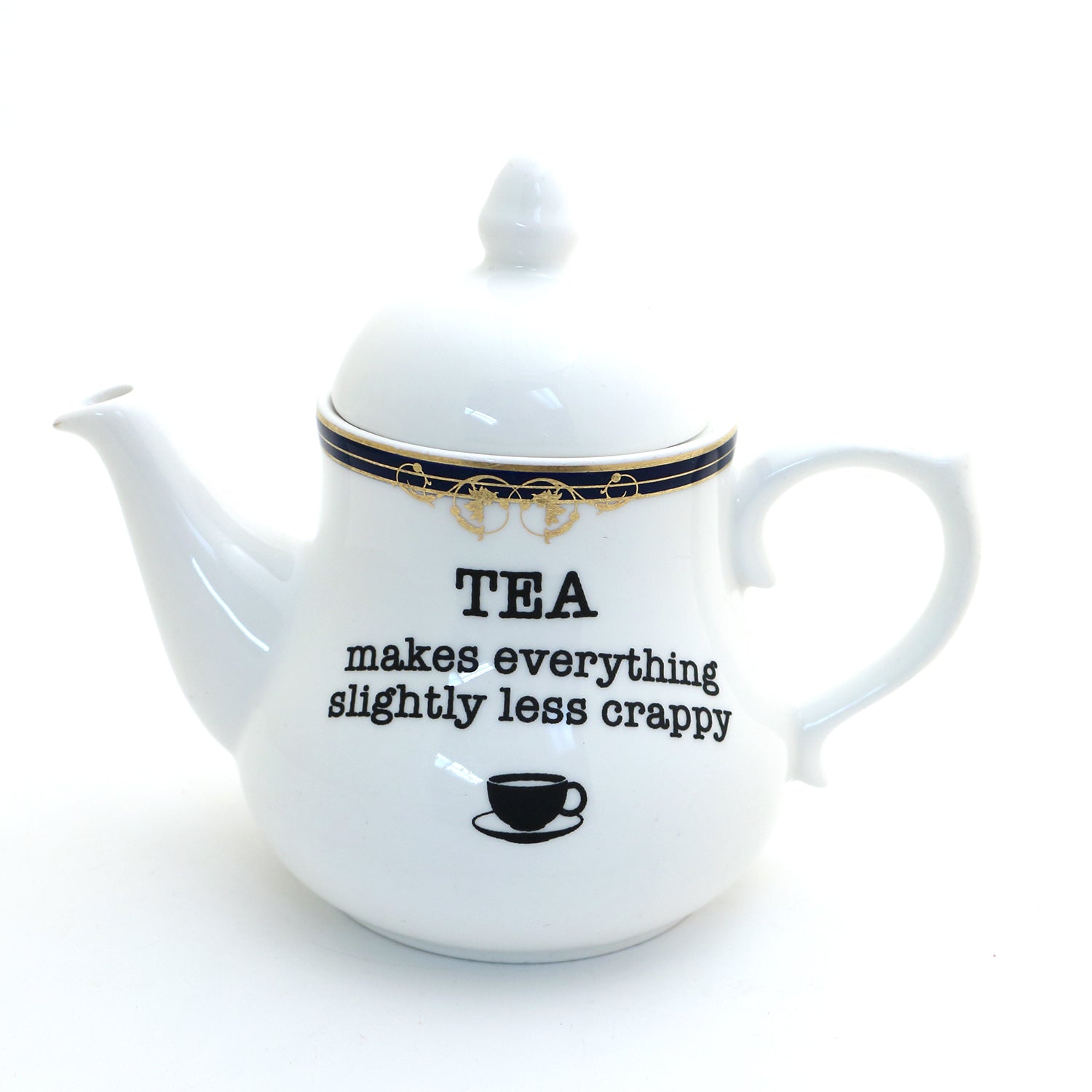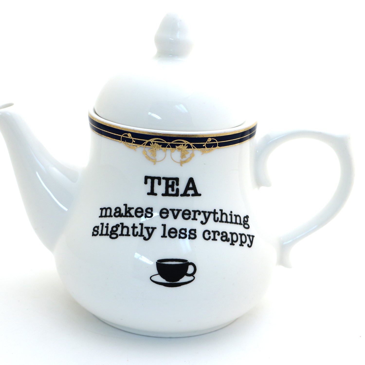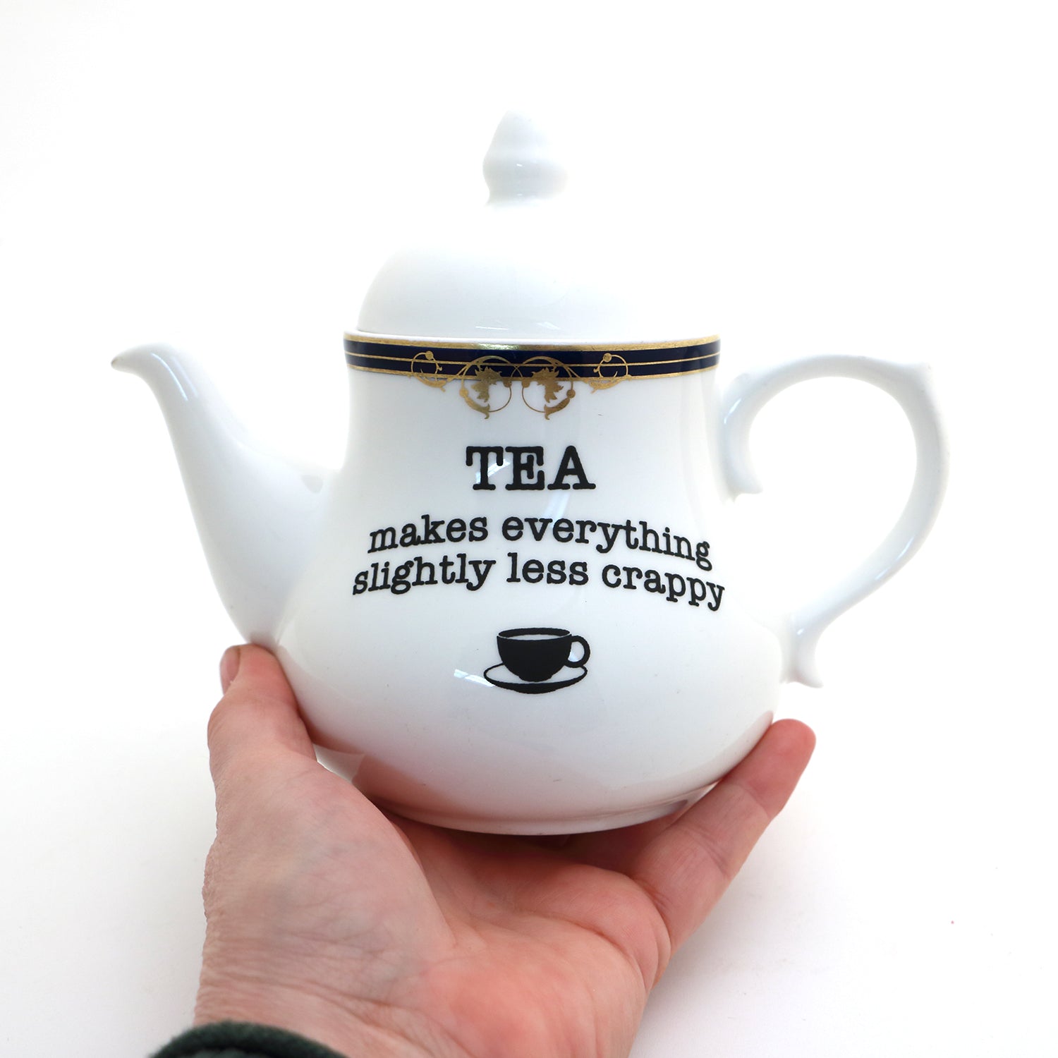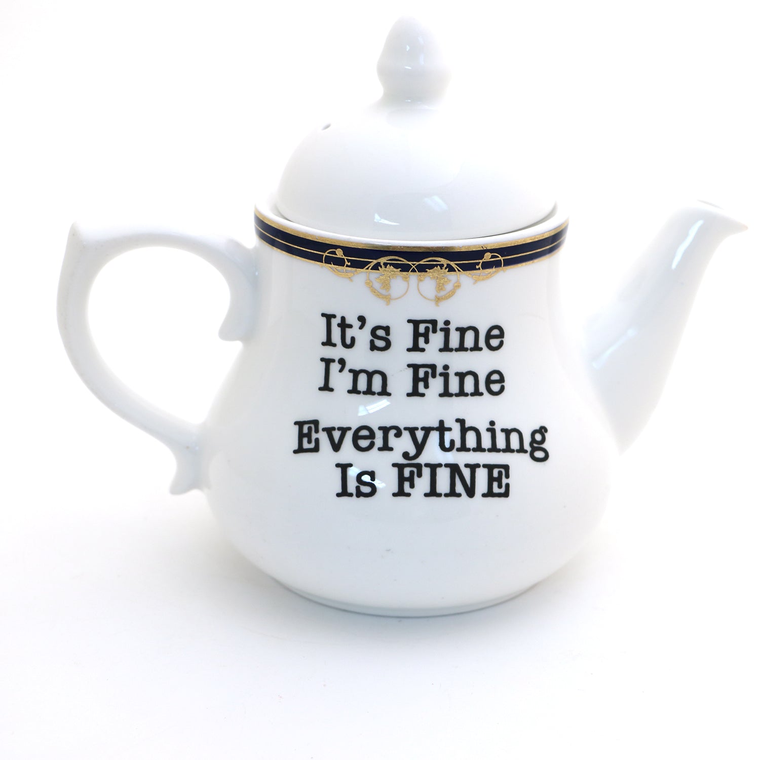 Vintage teapot created by Dudson China in Stoke-on-Trent England features cobalt blue and gold accents which I have altered by adding Tea Makes Everything Slightly Less Crappy on the front and It's Fine I'm Fine, Everything is Fine on the back. Makes a great gift for a tea drinker. Upcycled and restored to like new condition made to be used and enjoyed. It measures 6 inches high and holds 2 cups of tea.
